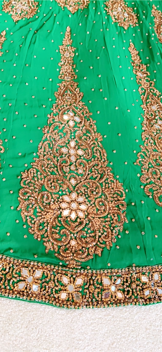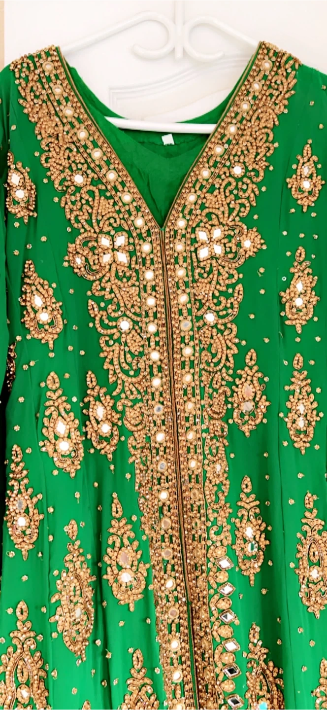 A vibrant green kameez dress with intricate gold embroidery and mirror work. The dress is embellished with beads and sequins all over. It features full-length sleeves and a V-neckline.