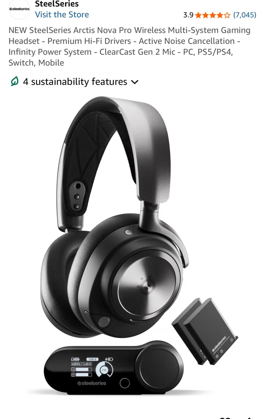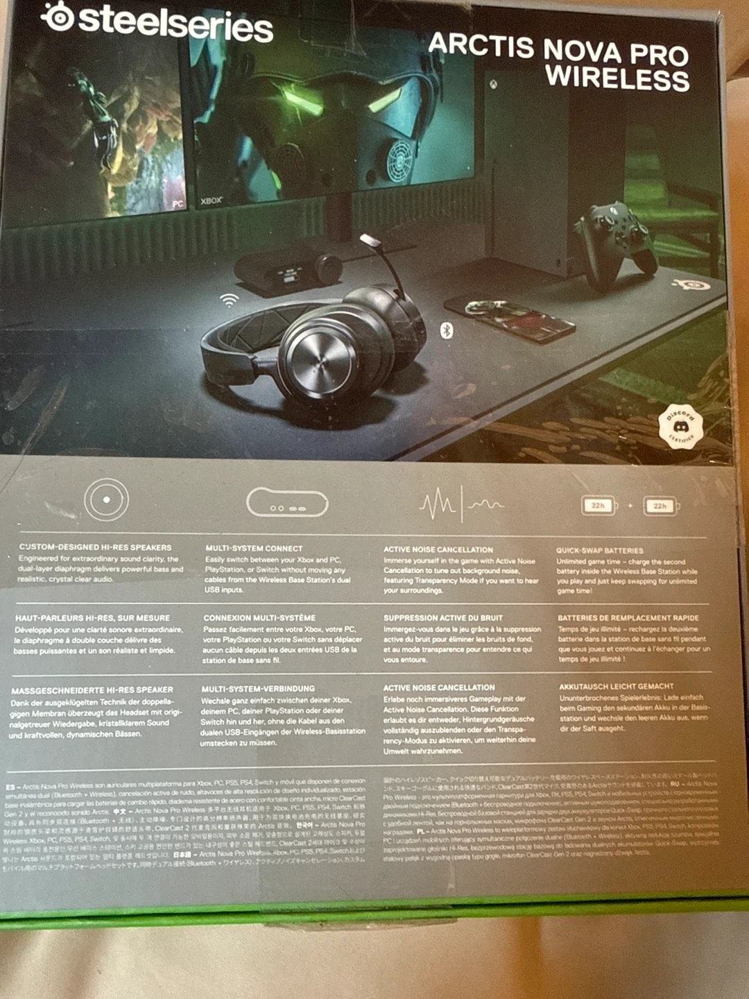 SteelSeries Arctis Nova Pro Wireless gaming headset. It features Hi-Fi drivers and active noise cancellation. Comes with a multi-system receiver and ClearCast Gen 2 mic.