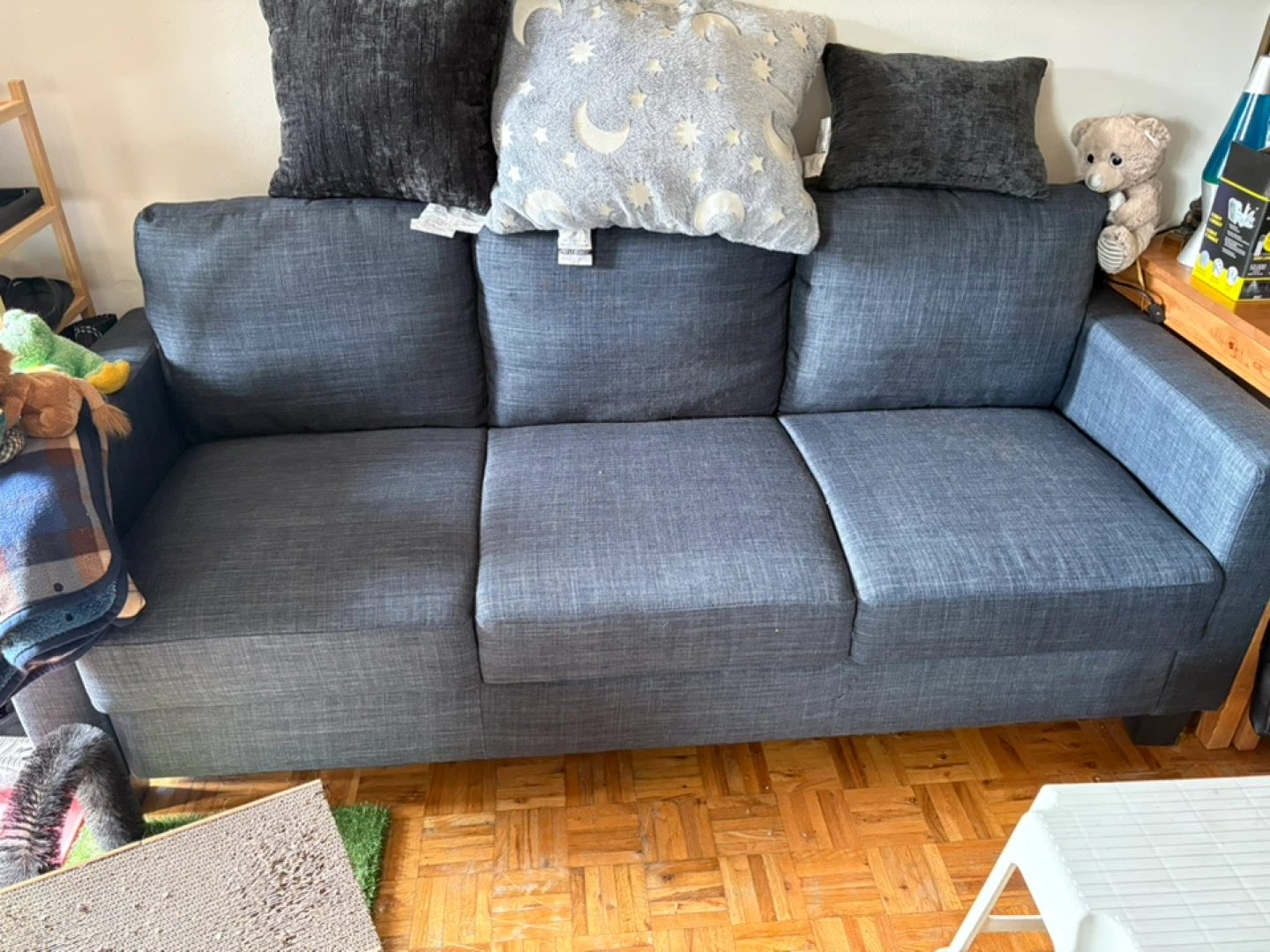 A comfortable 3-seater sofa in a dark blue fabric. It has clean lines and modern styling. Upholstered in a durable fabric perfect for everyday use.