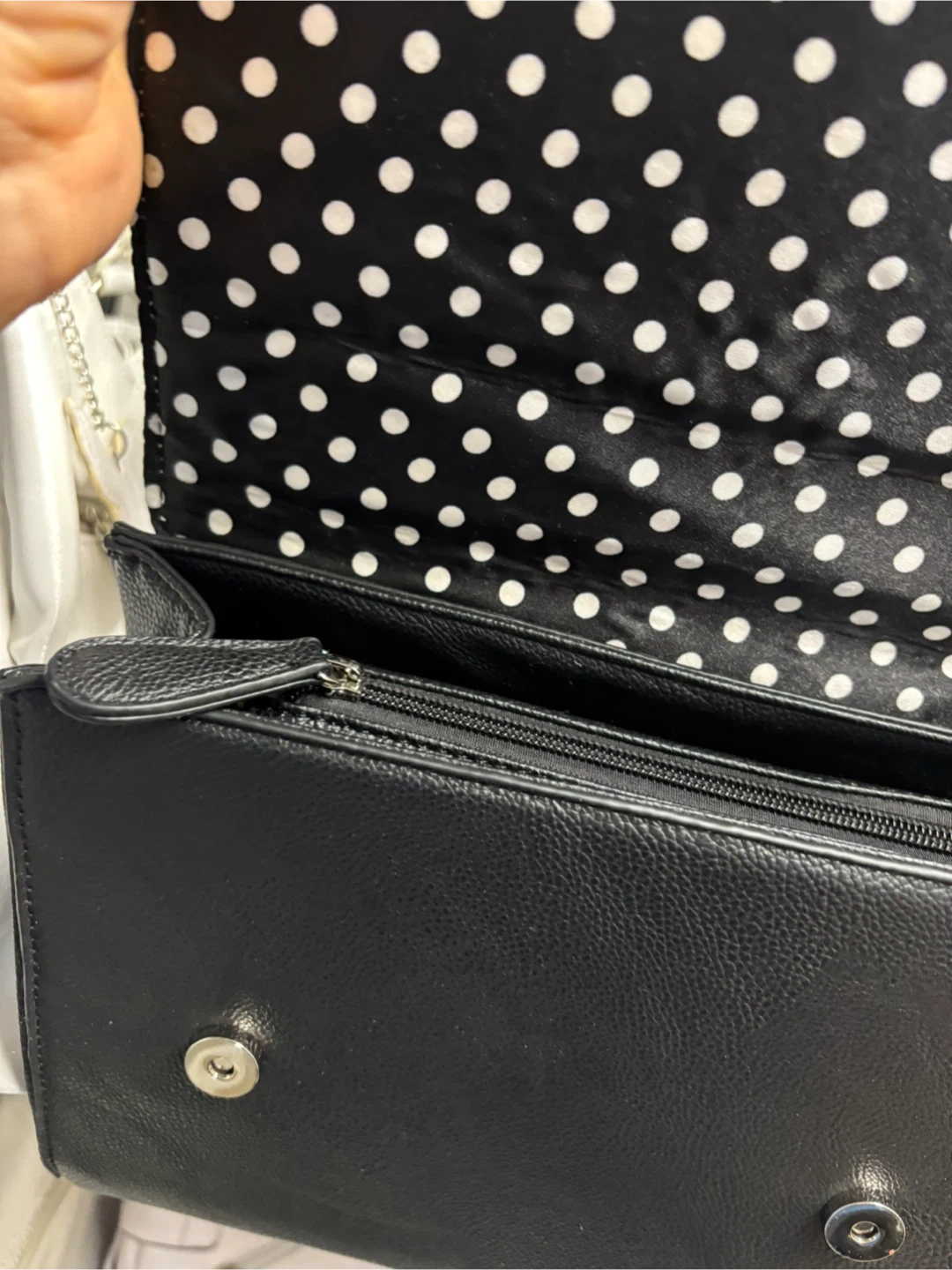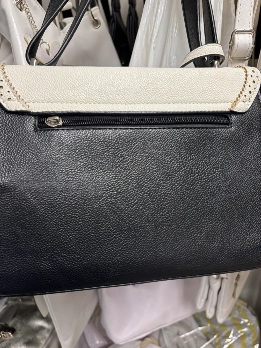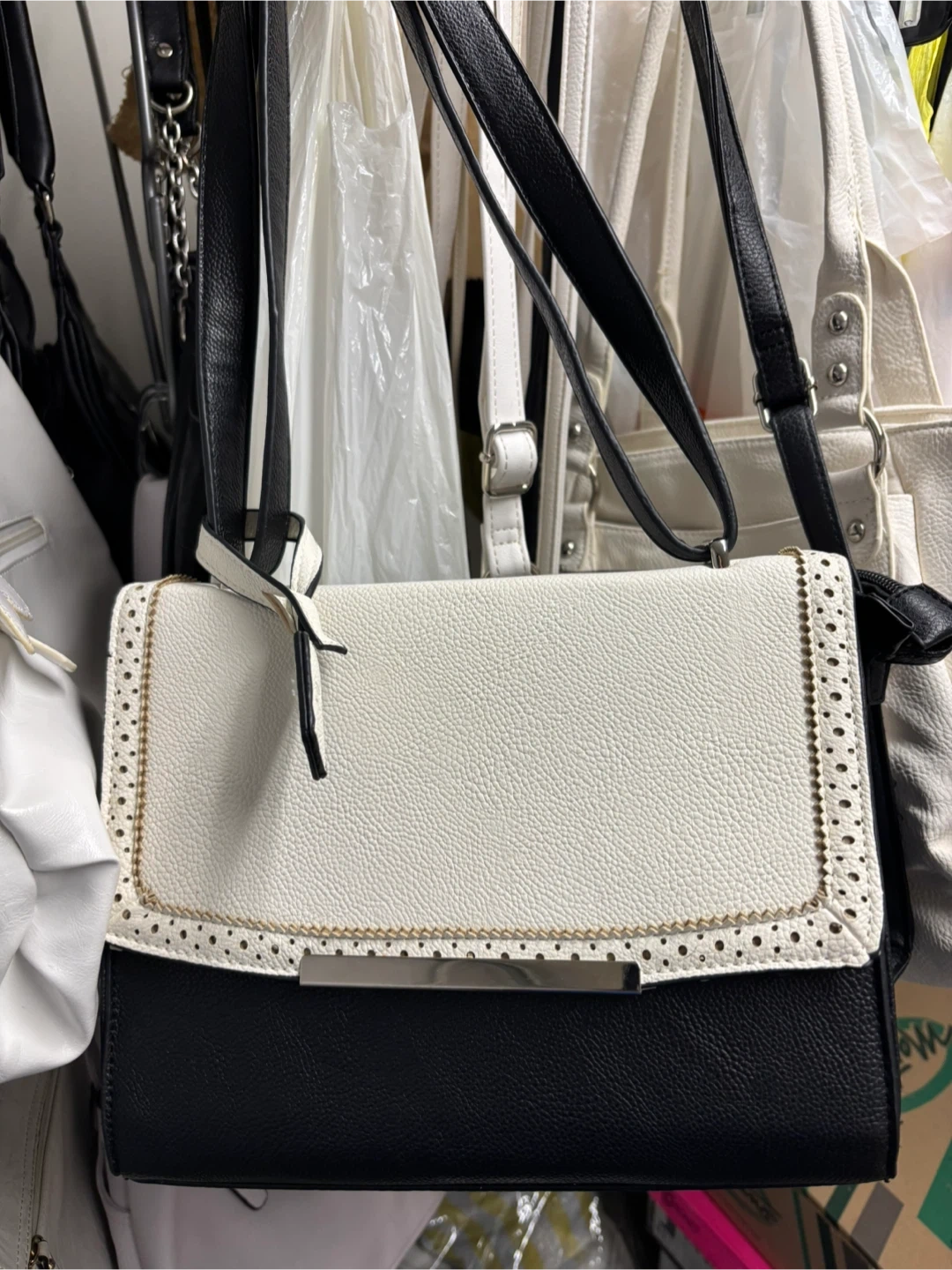 Stylish black and white crossbody handbag with a textured finish. Features a secure zipper closure on the back and a decorative perforated flap with gold-tone accents. The strap is adjustable for comfortable wear.
