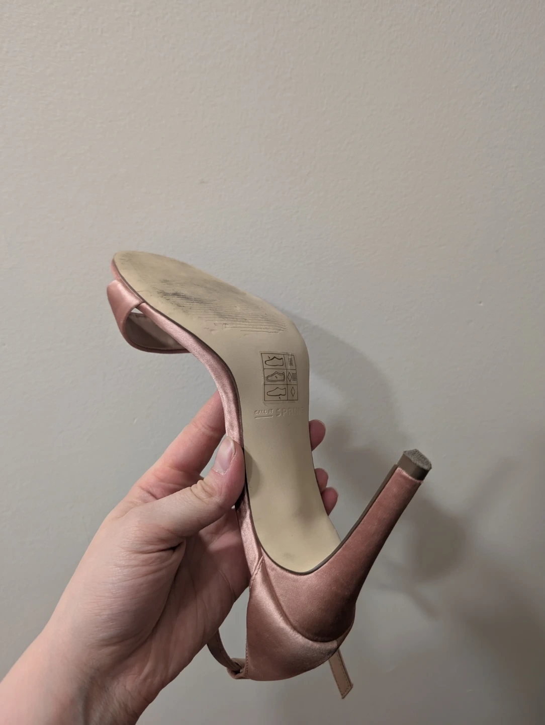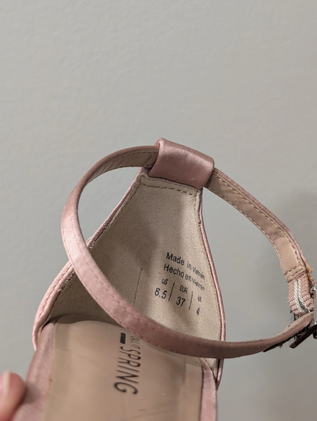 These Call It Spring heels feature a shimmering rose gold satin finish and an elegant ankle strap with buckle closure. The stiletto heel adds height. They're a size 6.5 US.