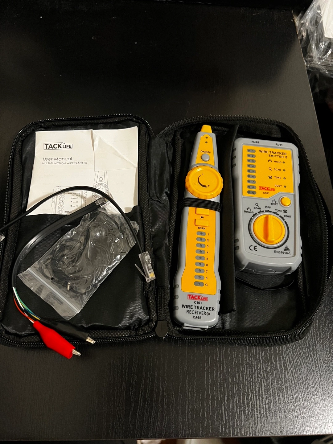 A network cable tool kit. Includes a cable tracker, crimping tool, and many other items. Great for networking technicians