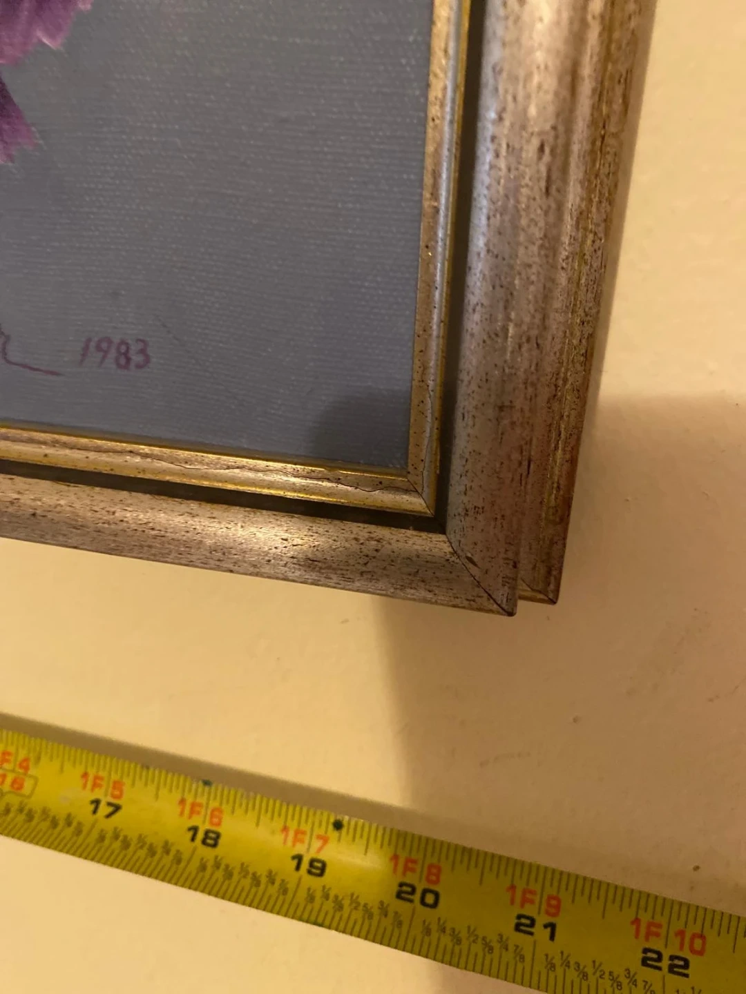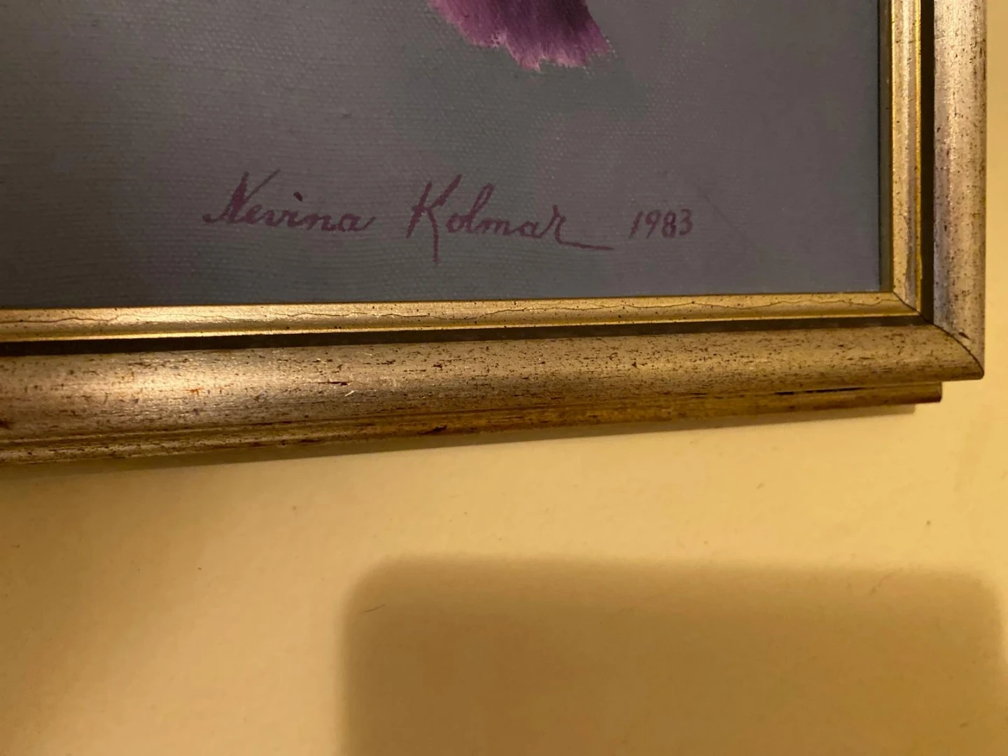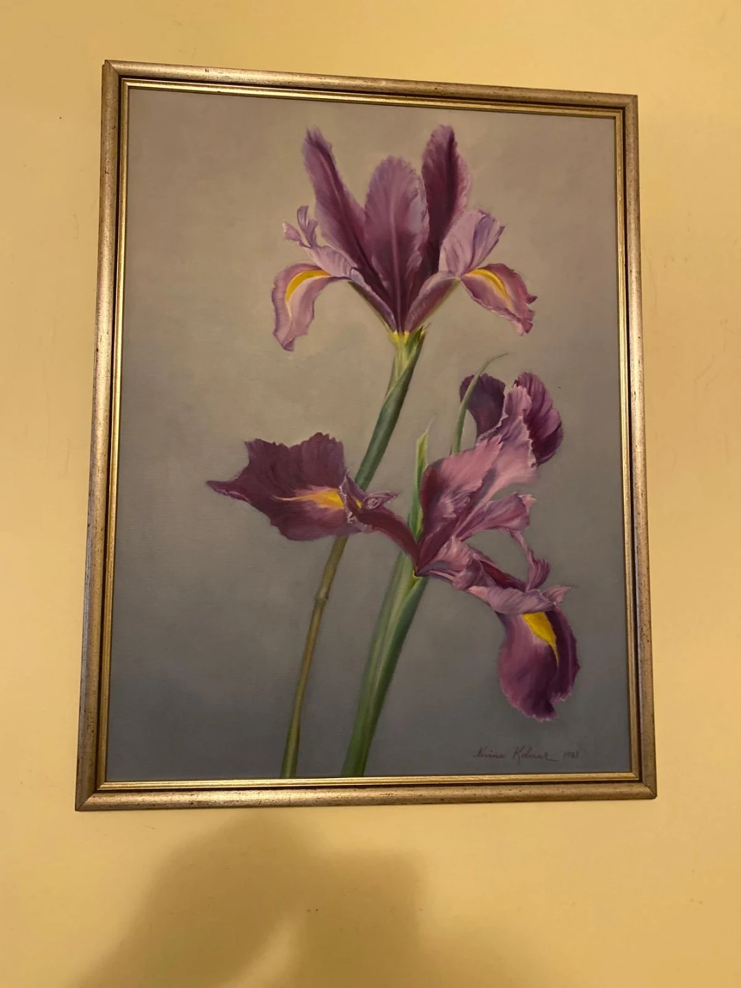 Selling a vintage Nivina Kolmar floral painting, signed and dated 1983. The frame is gold-toned and the painting features purple flowers. The painting measures approximately 26 inches in height.
