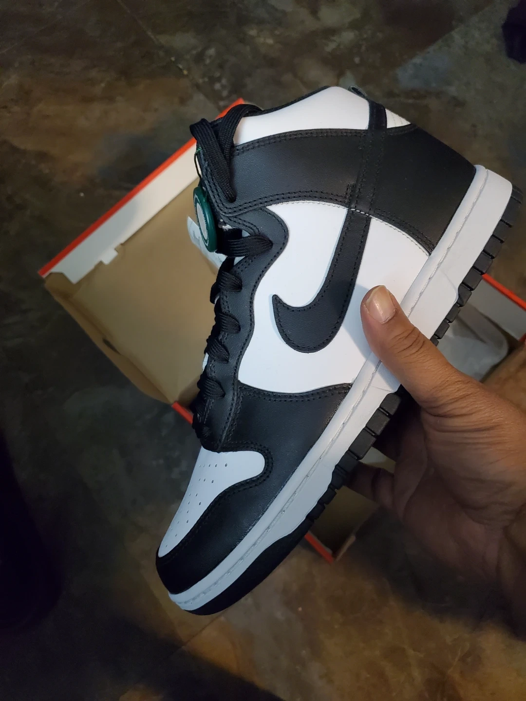 These are Nike Dunk High sneakers in a classic black and white colorway. They feature a leather upper with perforations on the toe box. Includes the original box.