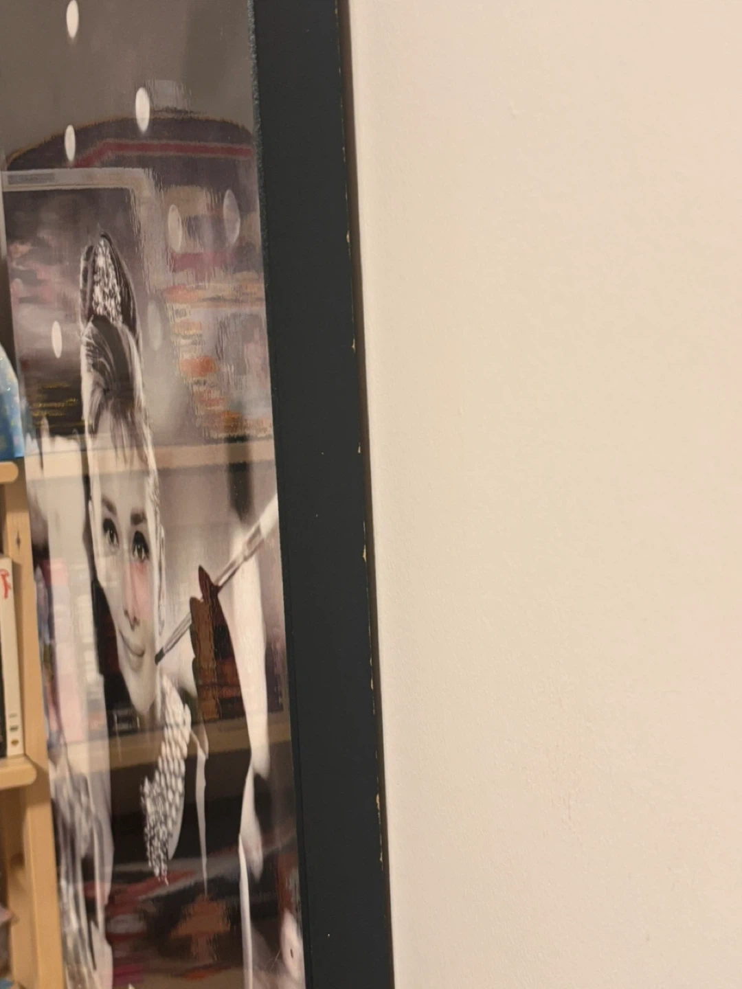 Black and white wall art featuring Audrey Hepburn from the iconic movie "Breakfast at Tiffany's". It's a great statement piece for any fan of classic Hollywood. Who wouldn't want a bit of timeless elegance on their wall! Some wear and tear pictured!