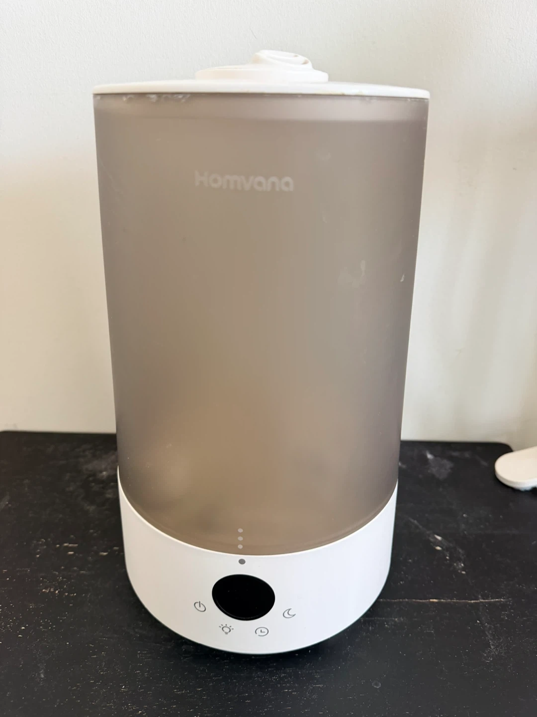 Homvana humidifier. This unit's translucent tank displays water levels with indicator dots. Features a power button, brightness control, timer, and night light setting.