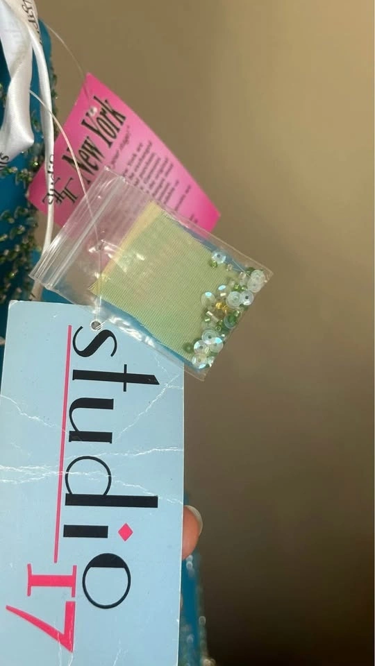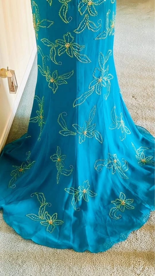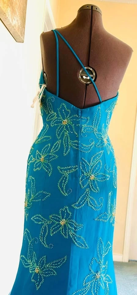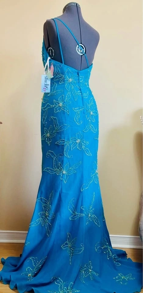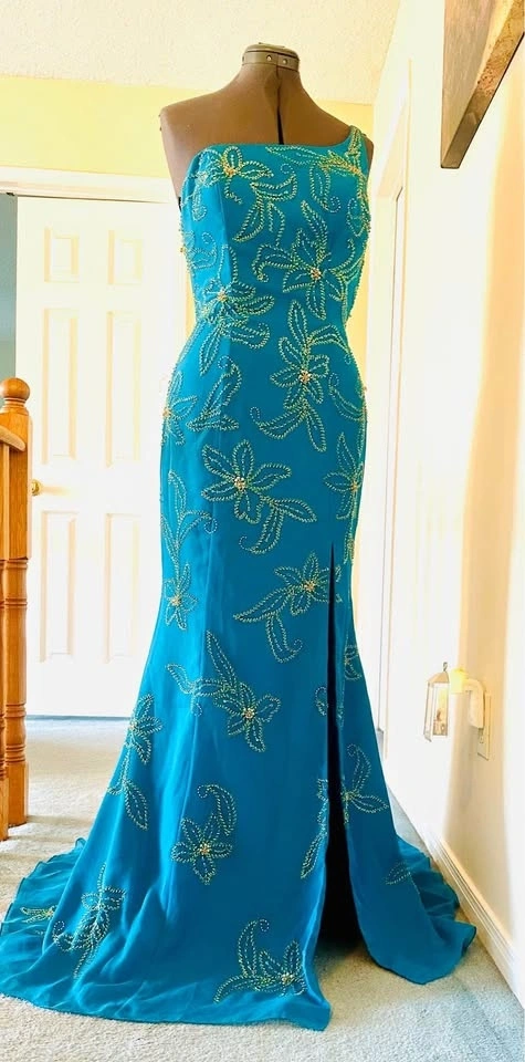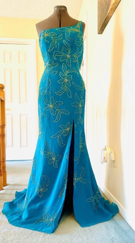 Step into elegance with this stunning Studio 17 blue floral Mermaid one shoulder evening gown. Perfect for special occasions, Prom night, this dress features intricate beaded floral designs that add a touch of sophistication. Brand new with the tags and extra beads and sequins. Beautifully tailored. Above the knee slit. Size 12. The last photo shows the measurements for the size. Non smoking no pets home.