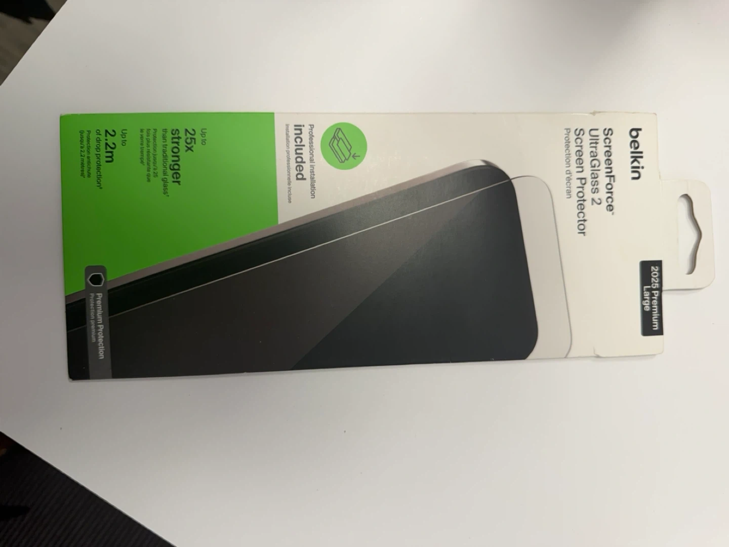 Belkin ScreenForce UltraGlass 2 screen protector for 2025 Large devices. It offers up to 25x stronger protection and up to 2.2m of drop protection. Professional installation is included, take it to a store for free installation.