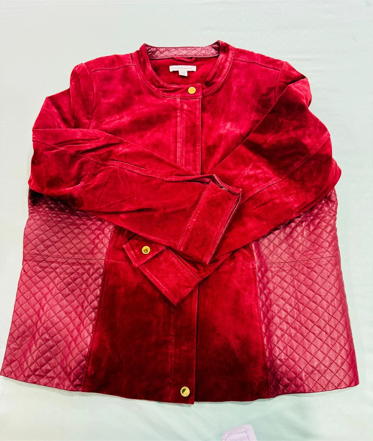 A stylish Isaac Mizrahi jacket featuring red suede and quilted accents. It has a round neckline and gold-tone button closures. Size is 18W