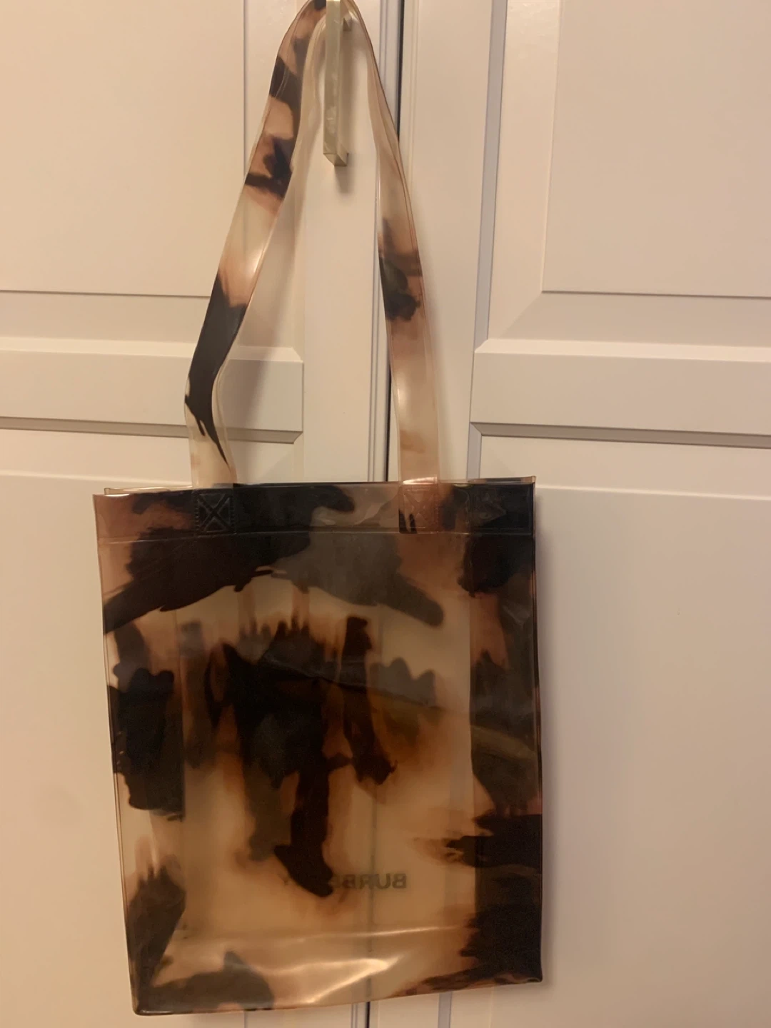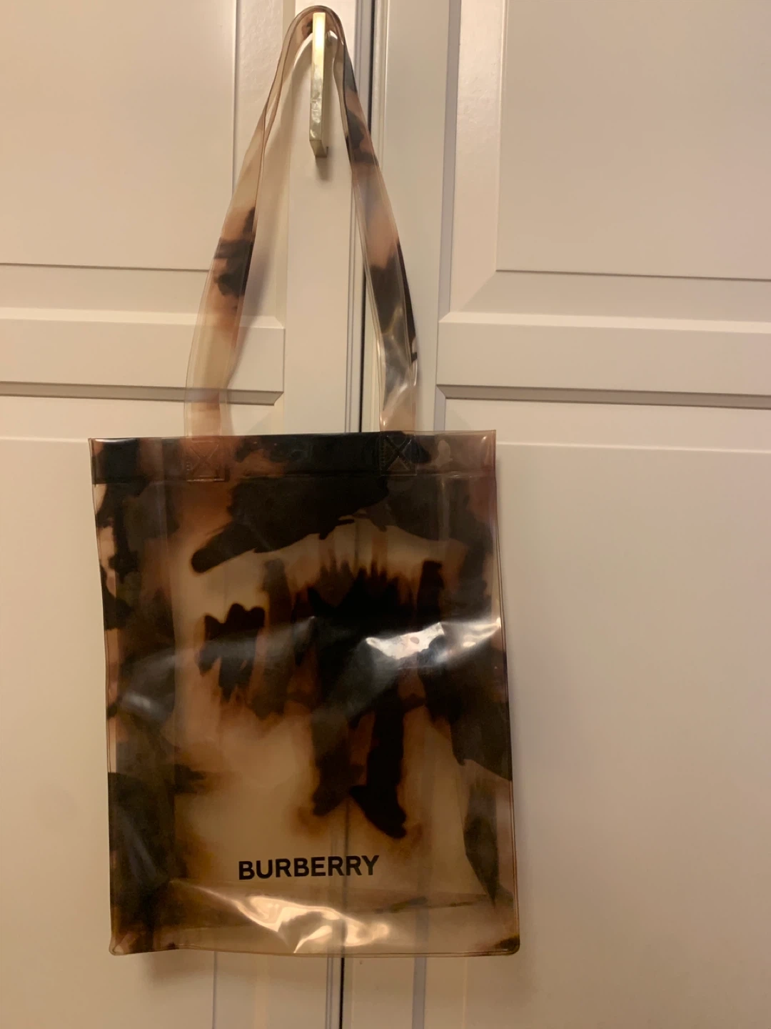 This is a Burberry clear tote bag with a tortoise shell print. It's made of PVC material. Genuine. Never used. Came with a purchase. Fits comfortably over your shoulder. Great for carrying everyday essentials!