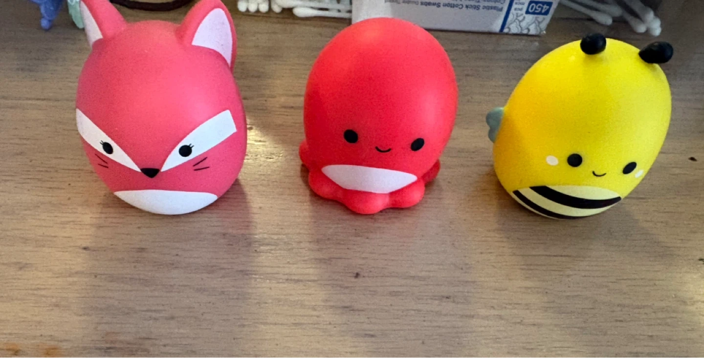 Set of three squishy toys including a pink fox, a red octopus, and a yellow bee. They're made of a soft, squeezable material.