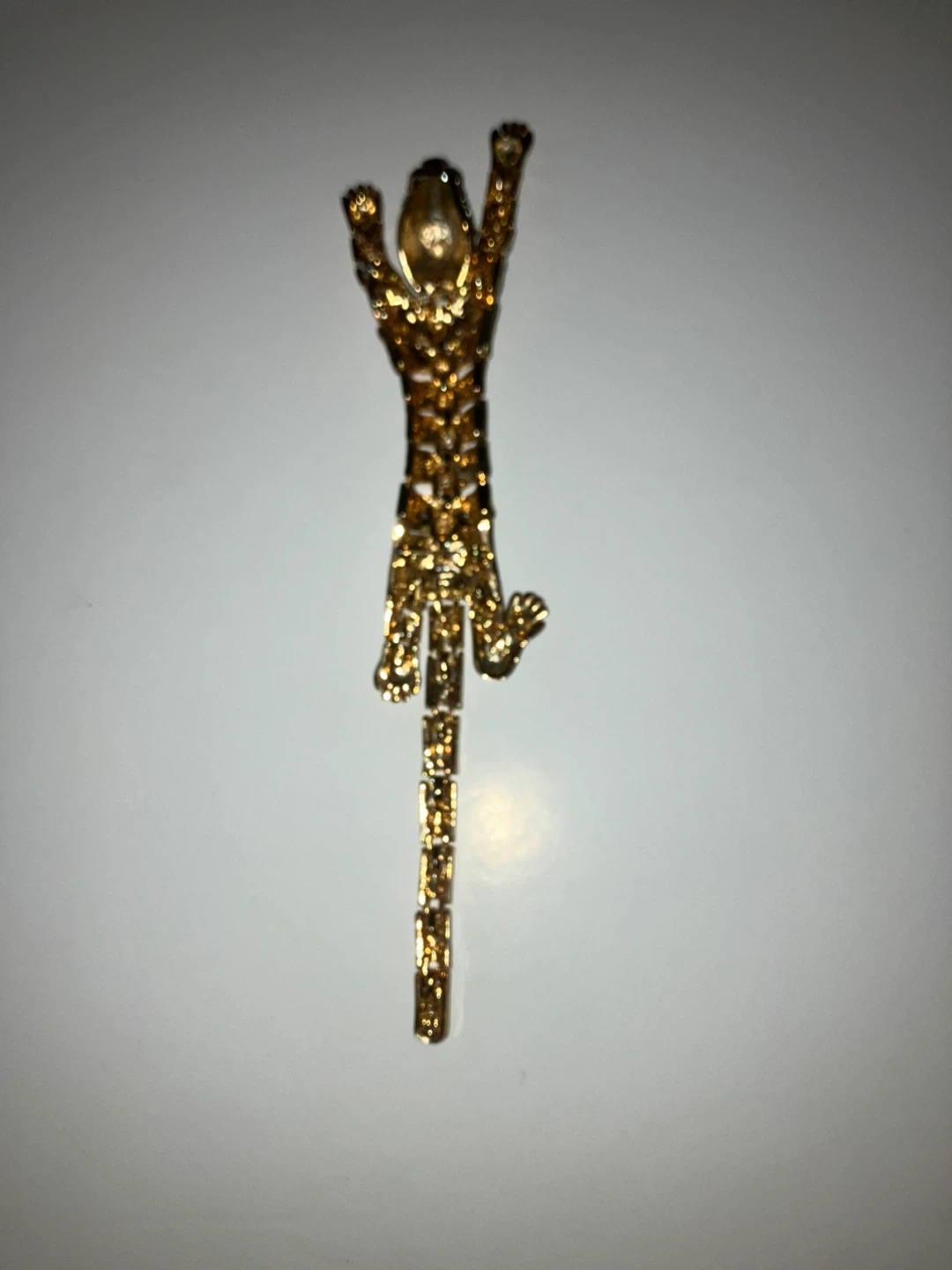 This sparkly panther brooch is covered in rhinestones. It's made with a gold-tone metal. A fun accessory to add flair to any outfit