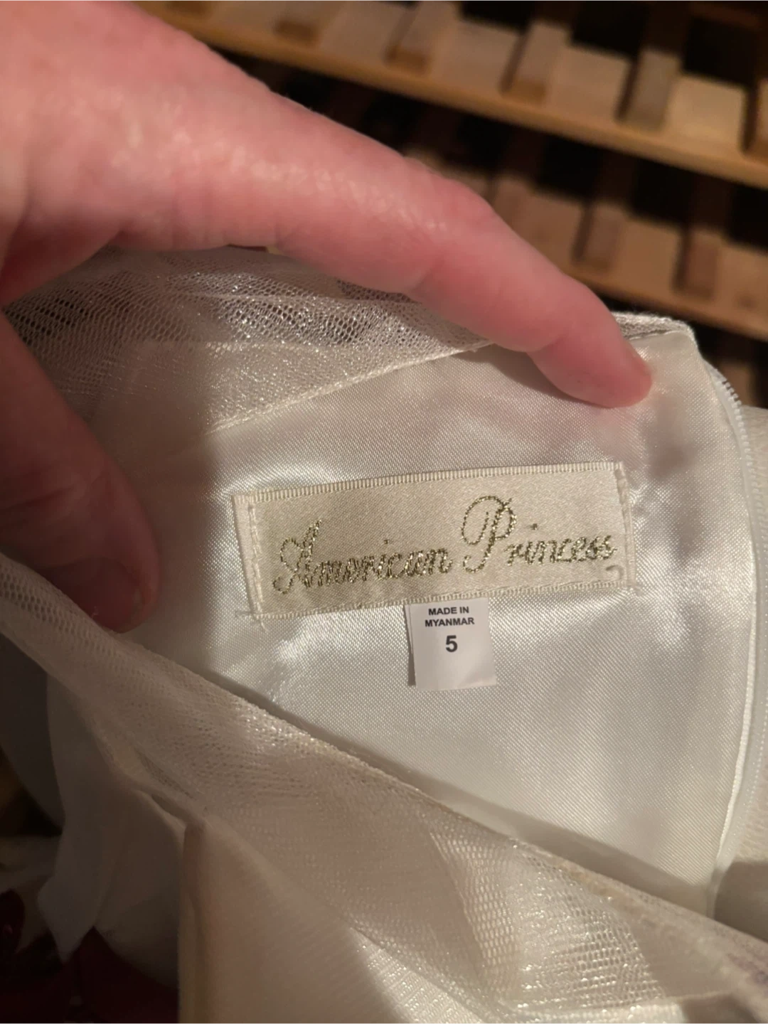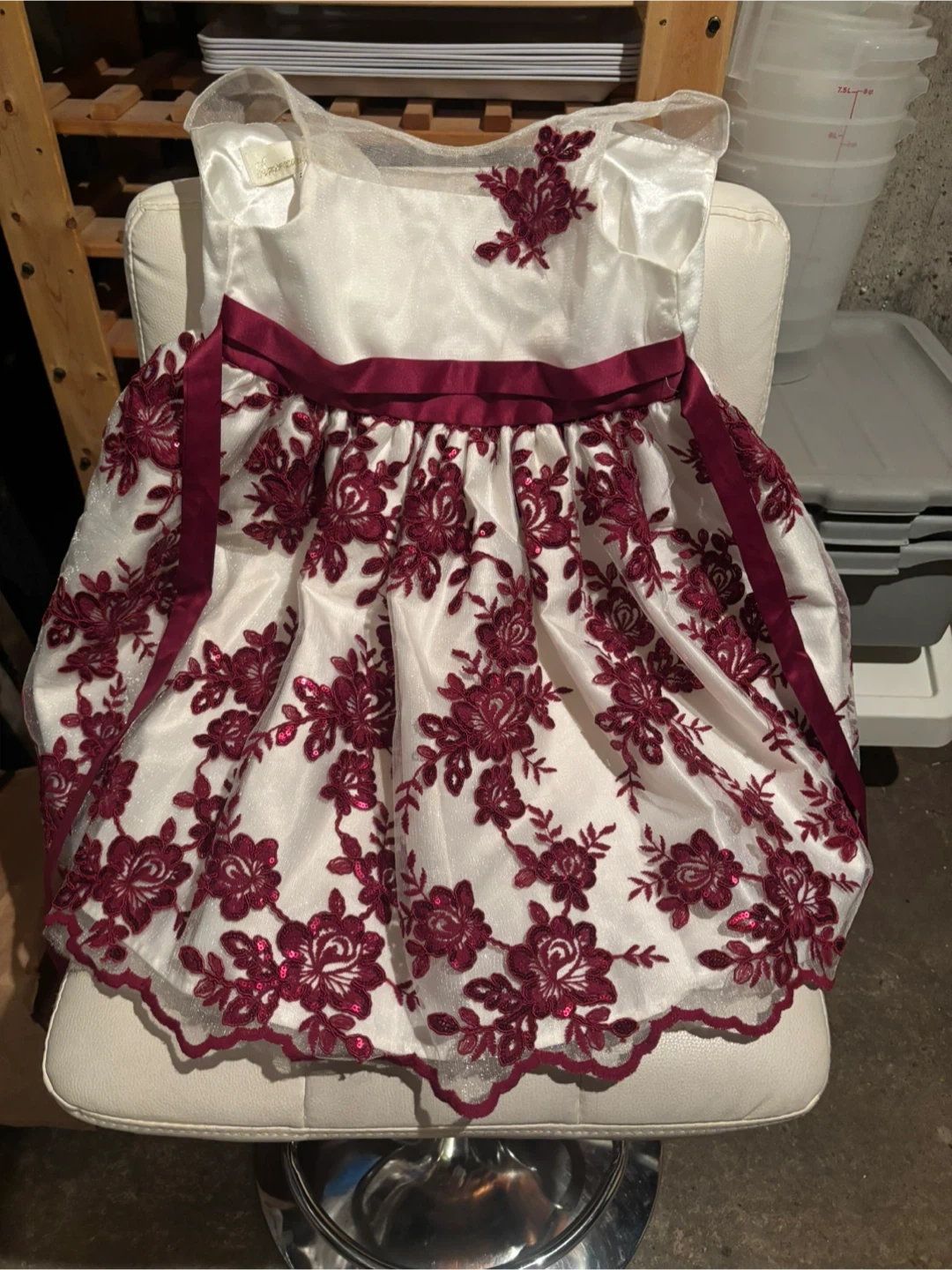 This beautiful American Princess dress features a white satin bodice with a burgundy floral lace overlay. It has a satin ribbon waistband and a full skirt with lace embellishments and subtle sequins. Made in Myanmar, it's a size 5.