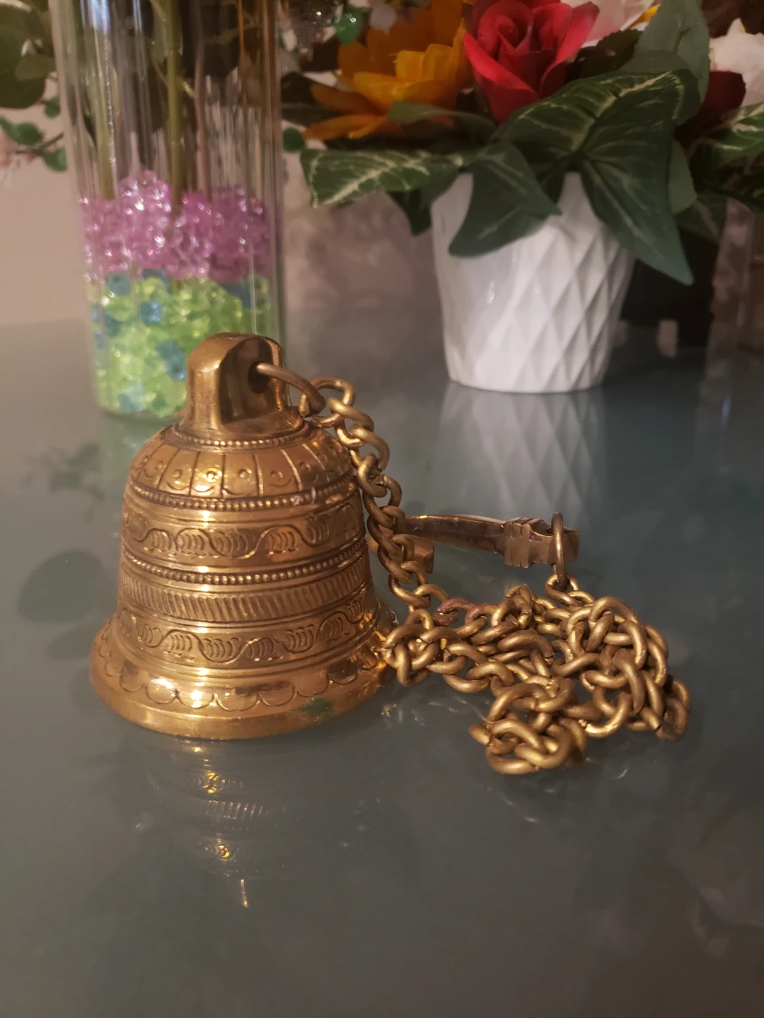 A lovely brass bell with an ornate design, attached to a sturdy chain with a key accent. It's made of metal and produces a clear ringing sound. This decorative piece could also serve as a service bell.
