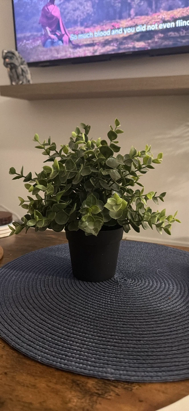 This is an artificial eucalyptus plant in a simple black pot. It's made of plastic and it's designed for indoor use. It adds a touch of greenery to any space without any upkeep. A few sprigs are slightly bent.