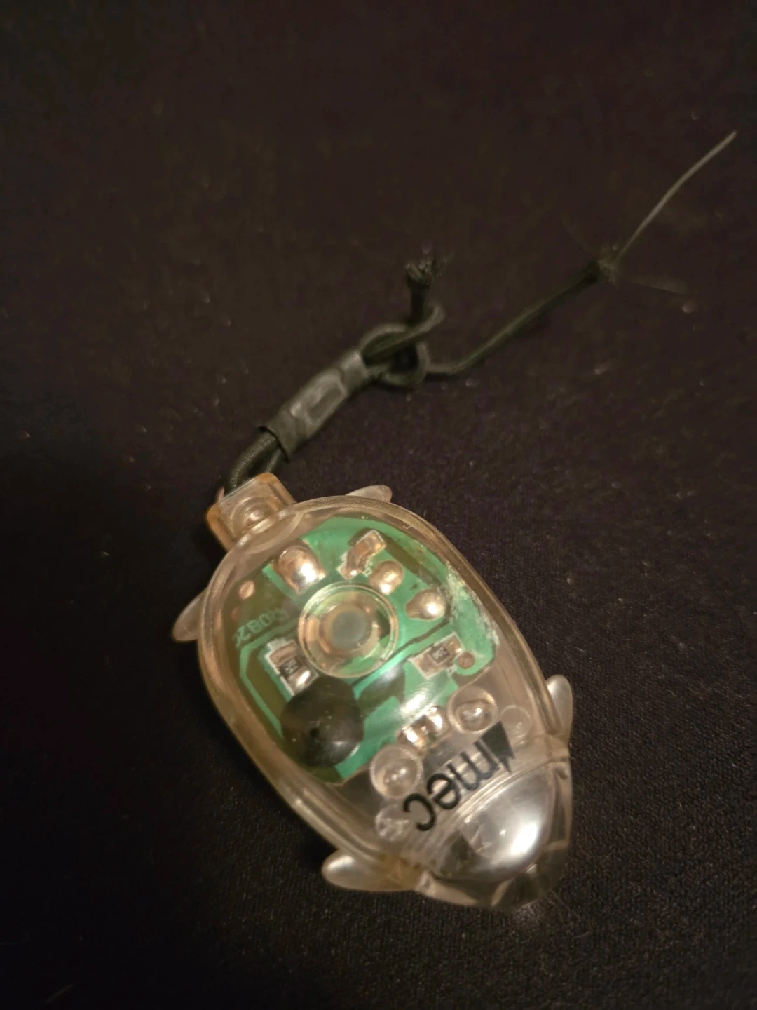A small, clear plastic keychain light from MEC. It features a mini LED and a convenient lanyard. Great for clipping onto backpacks or keys for a quick light source!