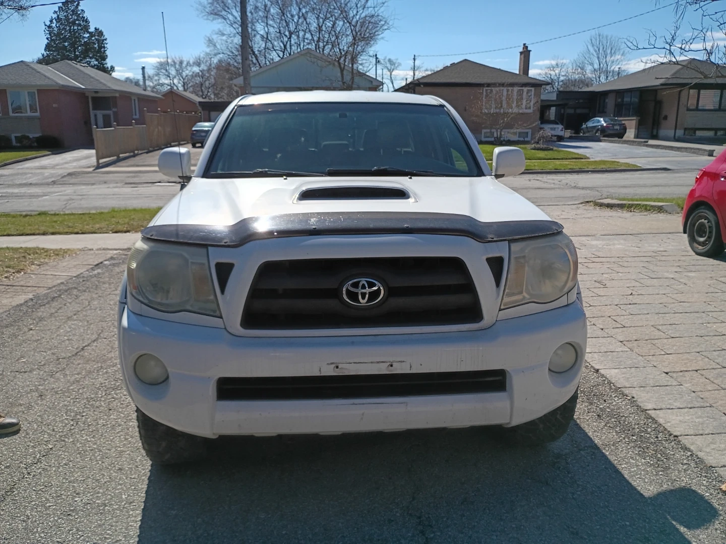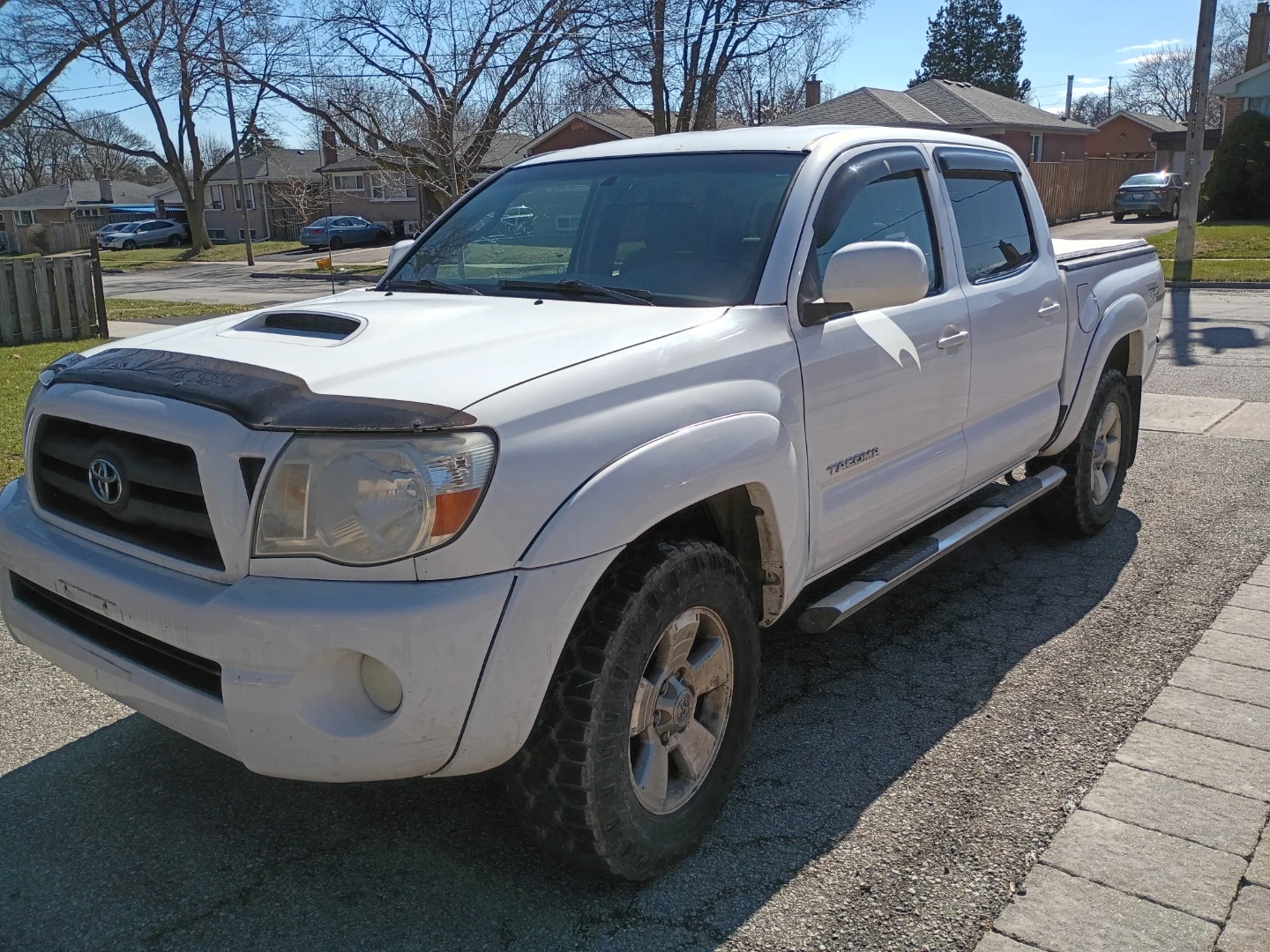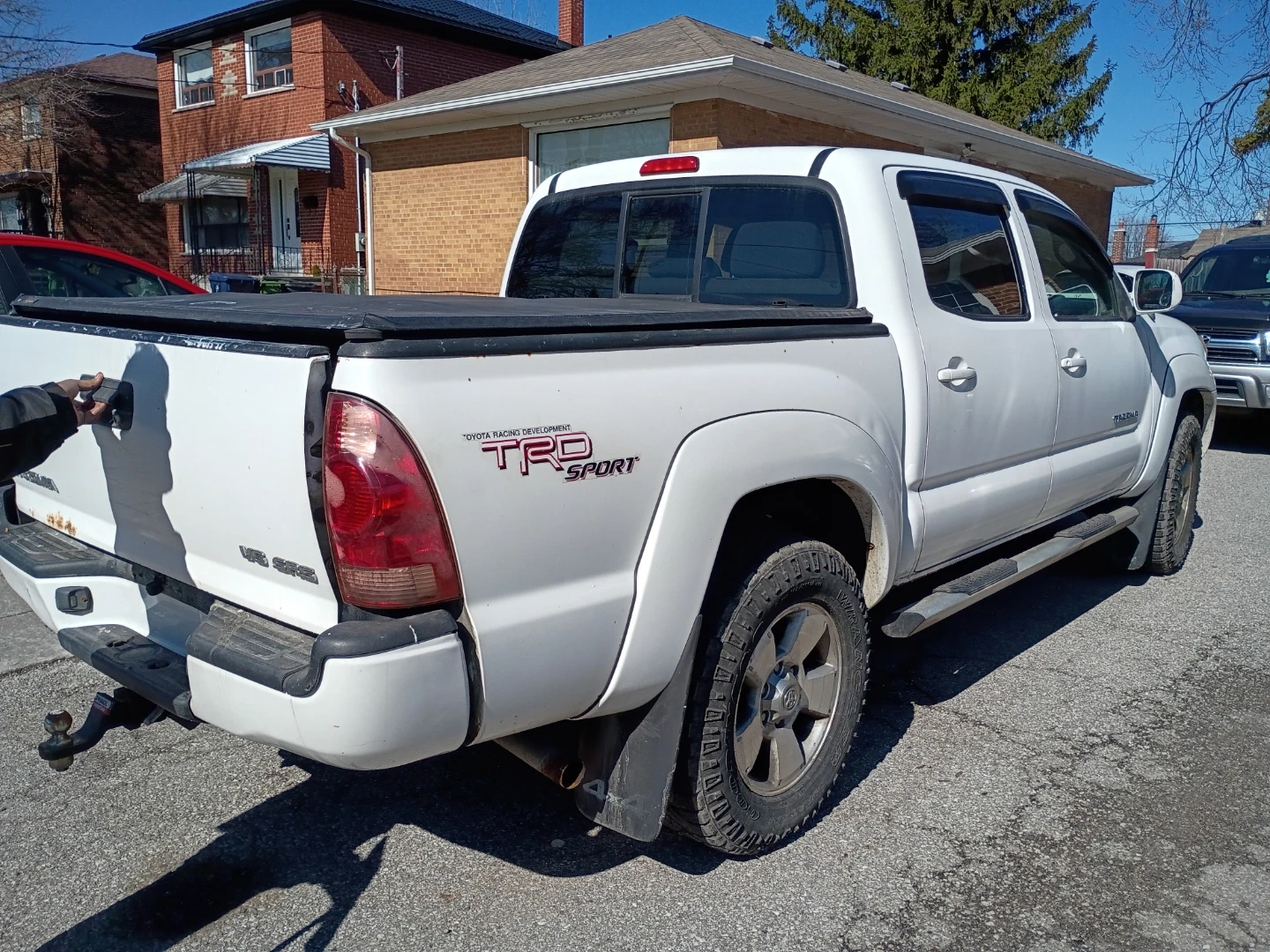 This white Toyota Tacoma TRD Sport is a V6 model. It features a double cab and a bed cover.