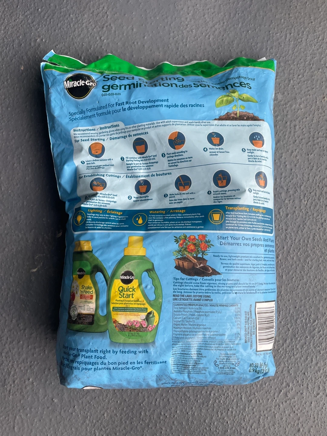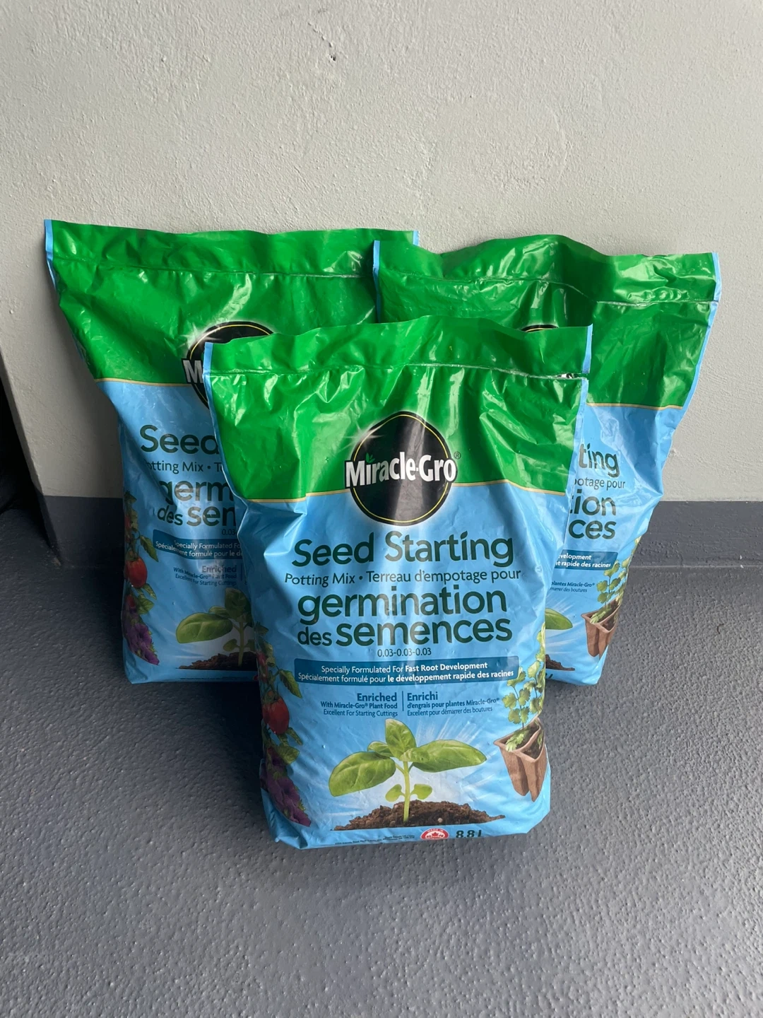 Three bags of Miracle-Gro Seed Starting Potting Mix for fast root development. Specially formulated for seedlings and cuttings. It's enriched with Miracle-Gro Plant Food. Good for starting your seeds and plants!