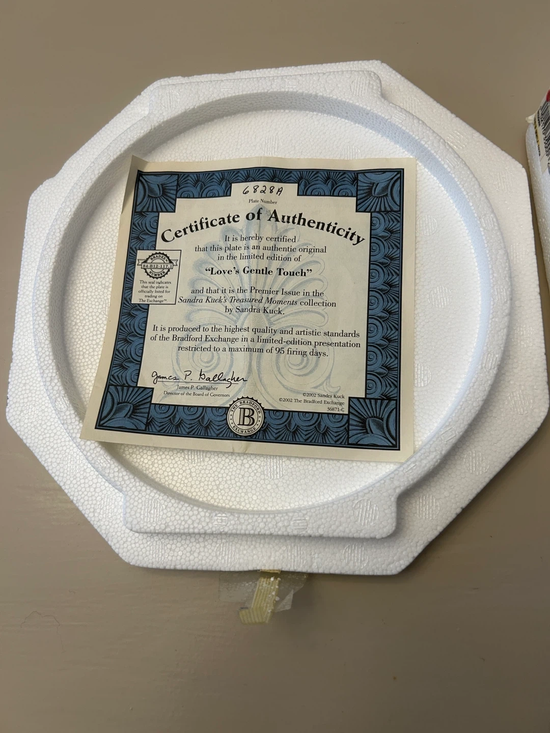 This is the "Love's Gentle Touch" collector plate, the premier issue in the Sandra Kuck Treasured Moments collection. It's produced to the highest quality standards in a limited-edition presentation. It comes with a Certificate of Authenticity. brand new and it’s original pack.