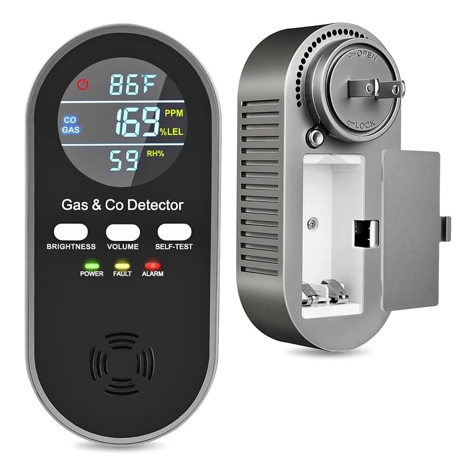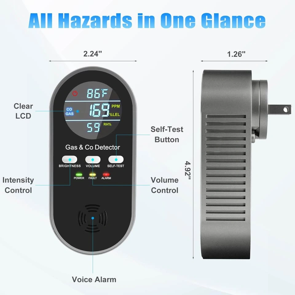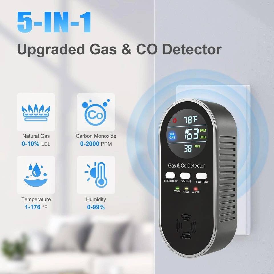 Handy 5-in-1 Gas & CO Detector. This upgraded detector has a clear LCD display. Detects natural gas, carbon monoxide, temperature, and humidity. It has brightness, volume, and self-test buttons. Voice alarm is included. Dual power with instant switch, plug & play, and 9V backup battery. Portable for outdoors. Measures around 2.24" x 1.26" x 4.92".
