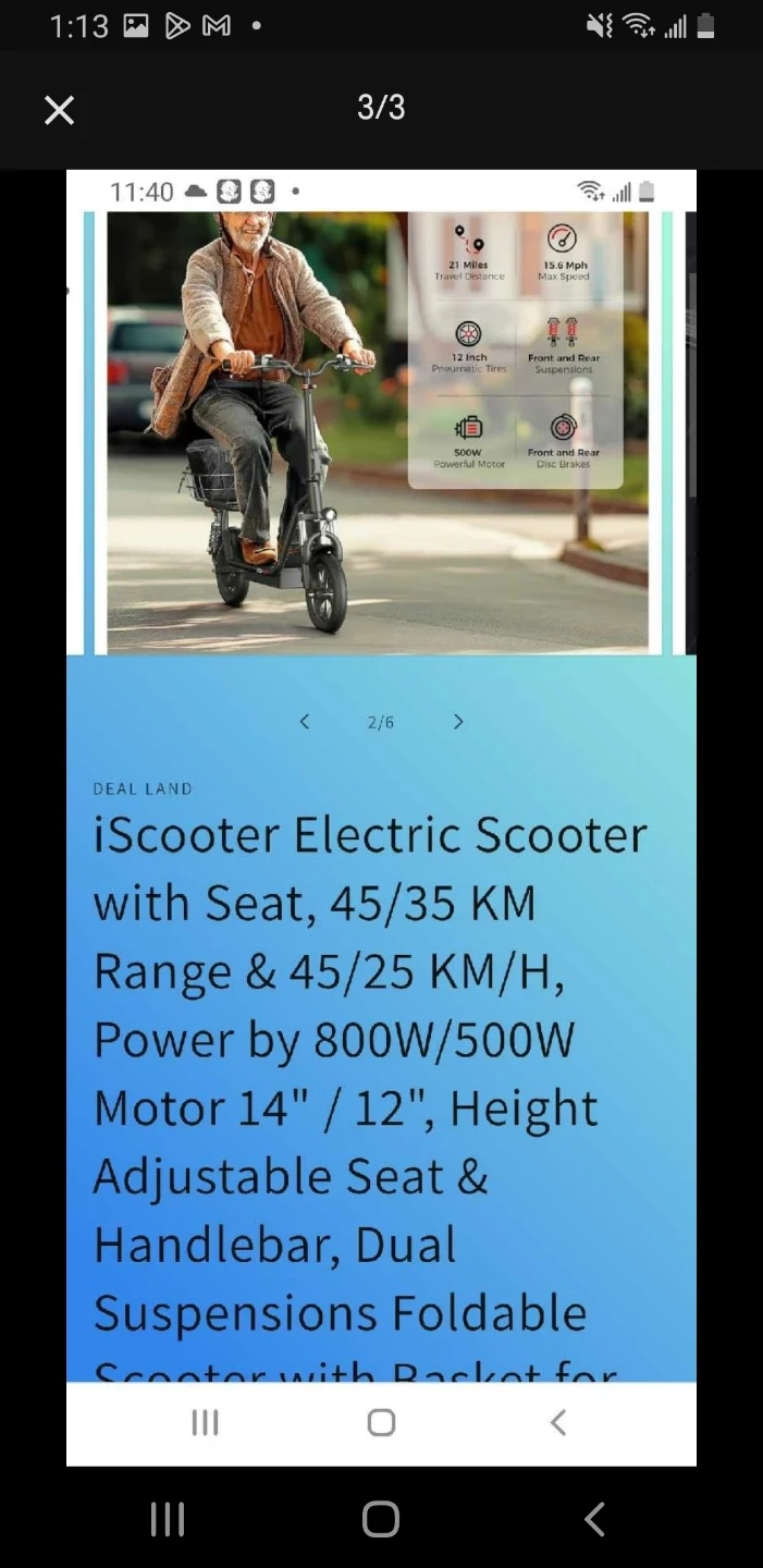 Selling an iScooter electric scooter with a seat. It features a 500W Ultra Motor and is portable and foldable. It has a 45/35 KM range and 45/25 KM/H. It's powered by an 800W/500W motor and has 14/12 inch tires. The scooter also has an adjustable seat and handlebar, dual suspensions, and is foldable