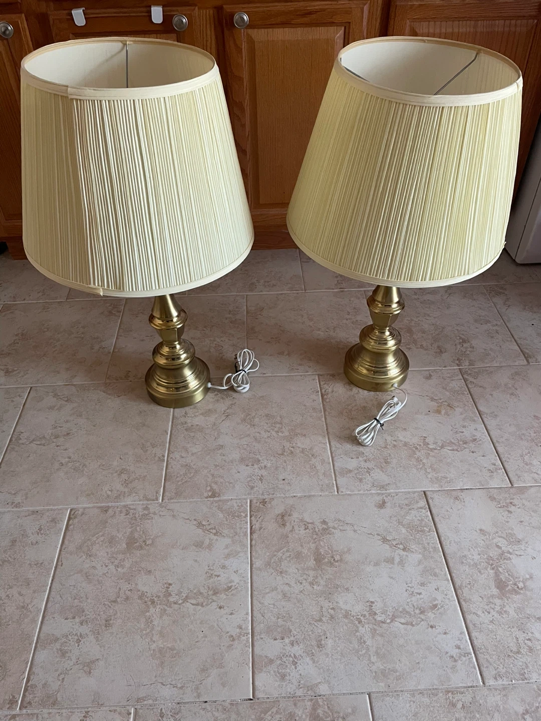 Selling a set of two brass table lamps. Each lamp features a fluted base and a pleated cream-coloured shade. They're a classic design that'll add a warm glow to any room. These lamps are perfect for your living room or bedroom.