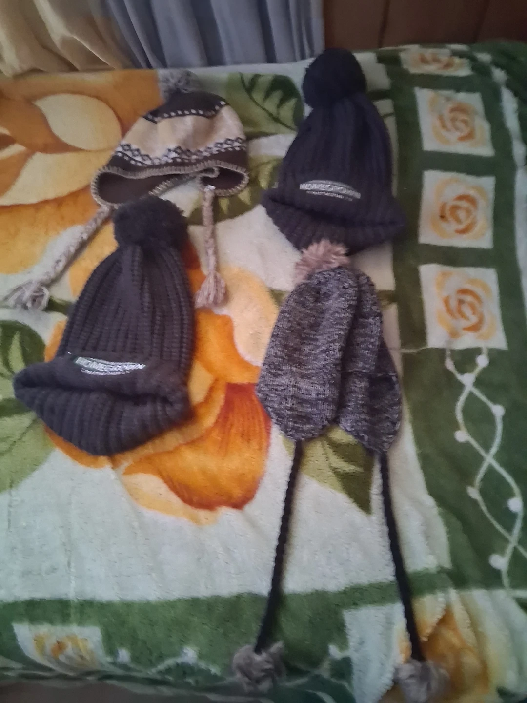 Four knit winter hats are included. Two are dark grey, one is a tan and brown pattern, and one is a marled grey. They all have pom-poms and some have decorative tassels. They're made of a soft knit material.