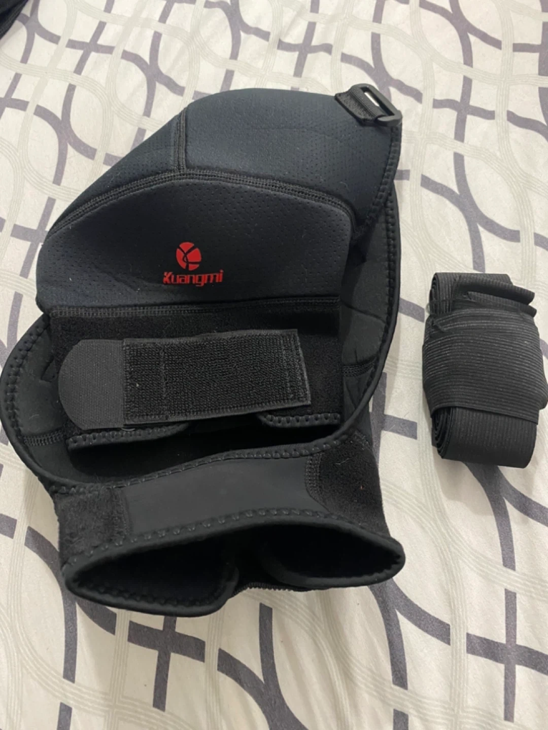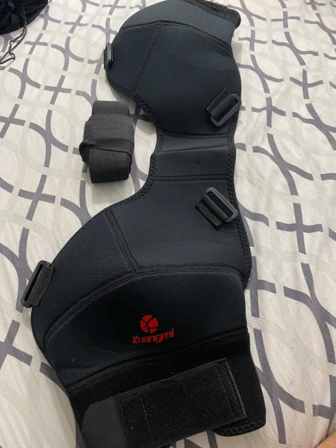 Selling a Kuangmi shoulder brace in black. It appears to be in good condition and includes a separate strap. Great for providing support and compression!