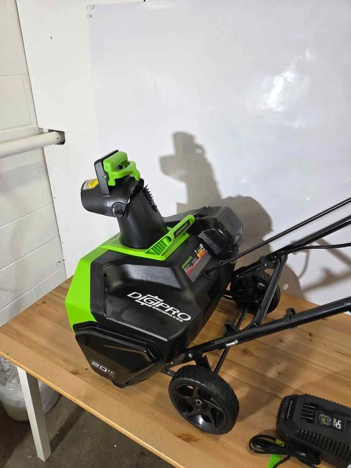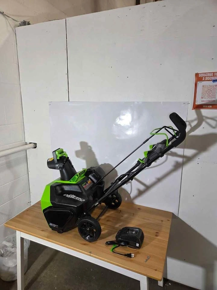 New. 40V cordless power for efficient snow clearing without gas. 20-inch clearing width covers driveways and sidewalks fast. Brushless motor for longer runtime and better performance. Throws snow up to 20 ft for easy removal. Includes battery and charger for ready-to-use setup. Great for home use in winter, easy to handle and store.