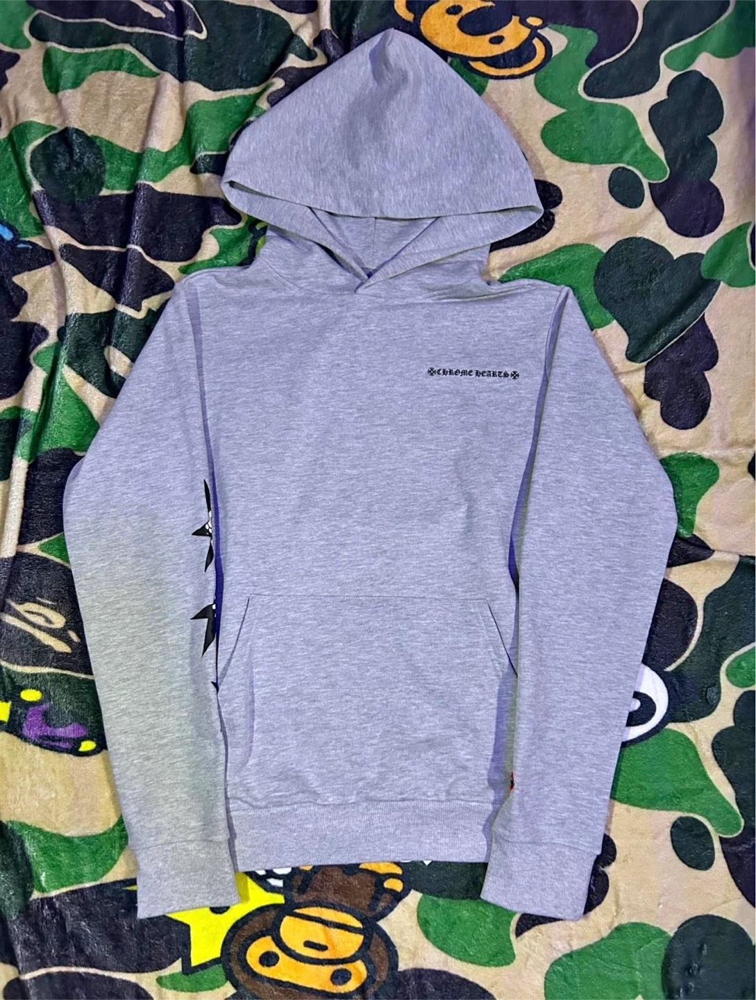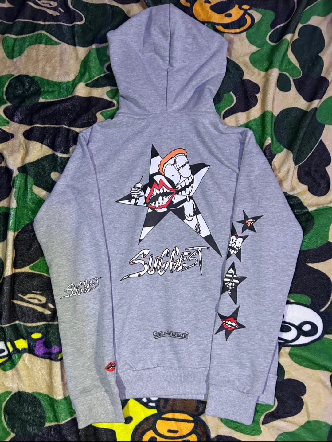 Selling a Chrome Hearts Suggest hoodie in grey! Features a unique star and character design on the back and sleeves. In great condition and ready for a new owner!