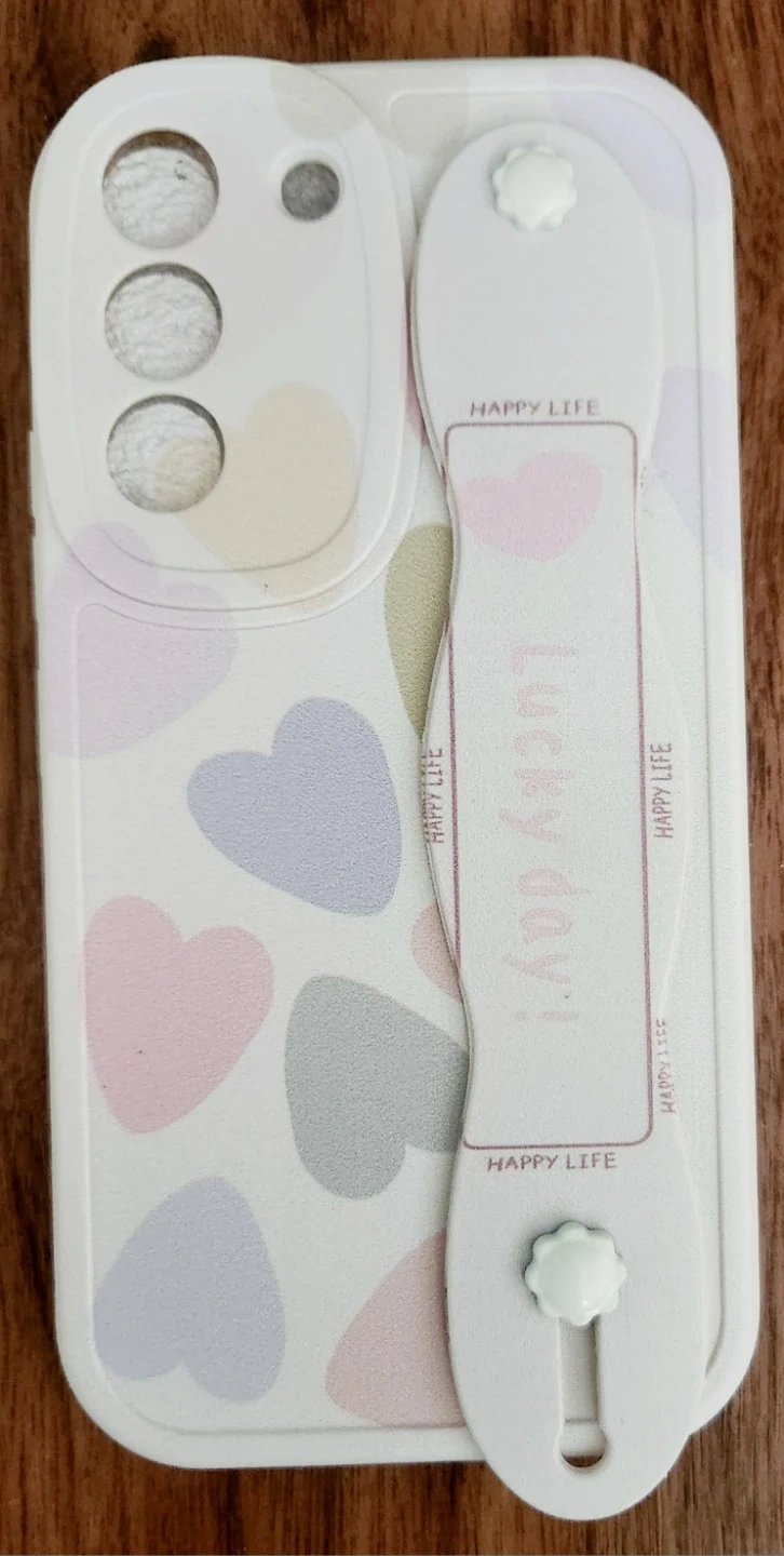 Cute phone case with a heart pattern design and a convenient strap for a secure grip! It says "Happy Life" and "Lucky day" on the strap. (Samsung S22)
