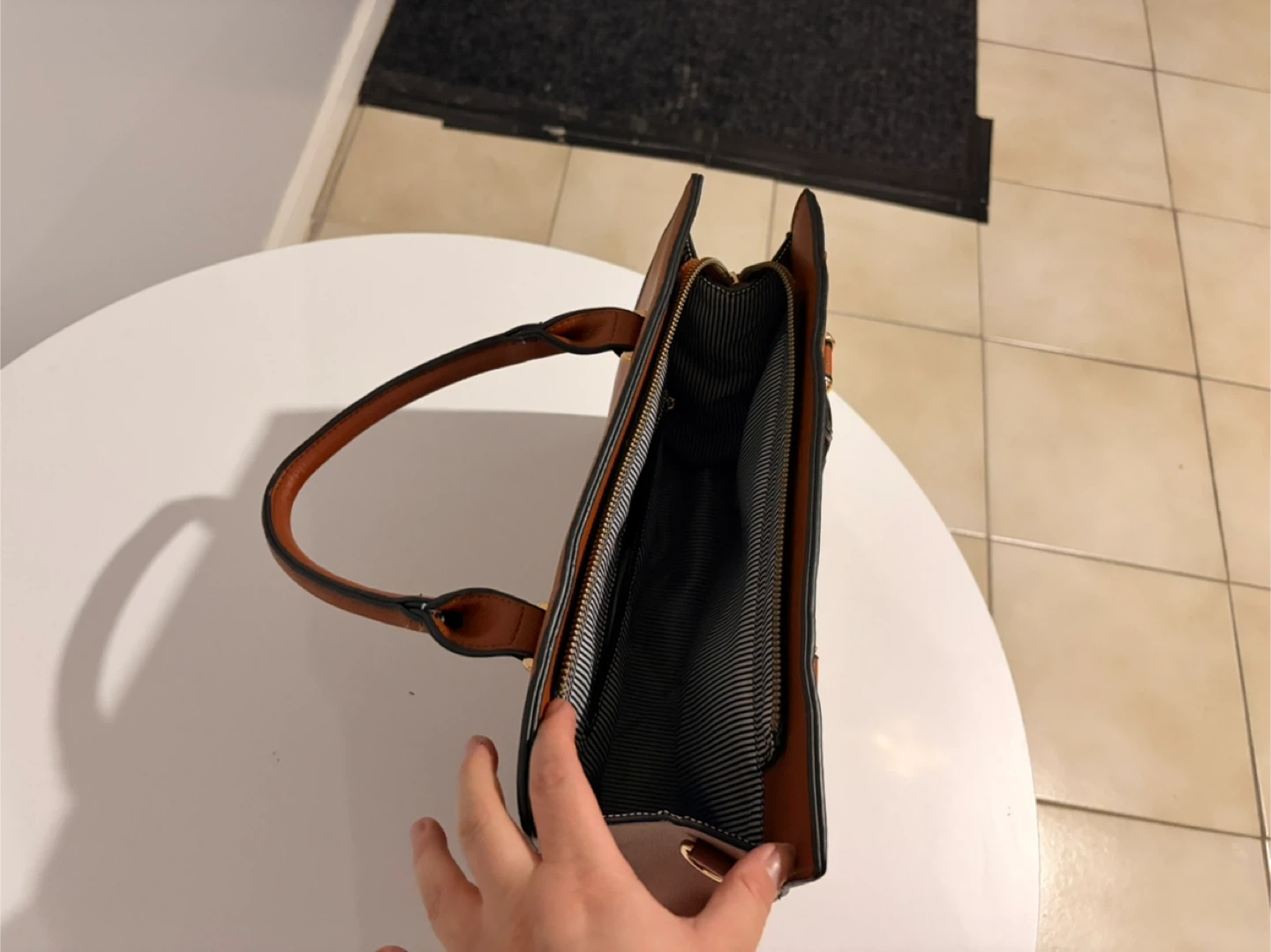 This brown tote handbag is made of faux leather with braided accents on the sides. It features a zippered main compartment. A stylish accessory for everyday use!