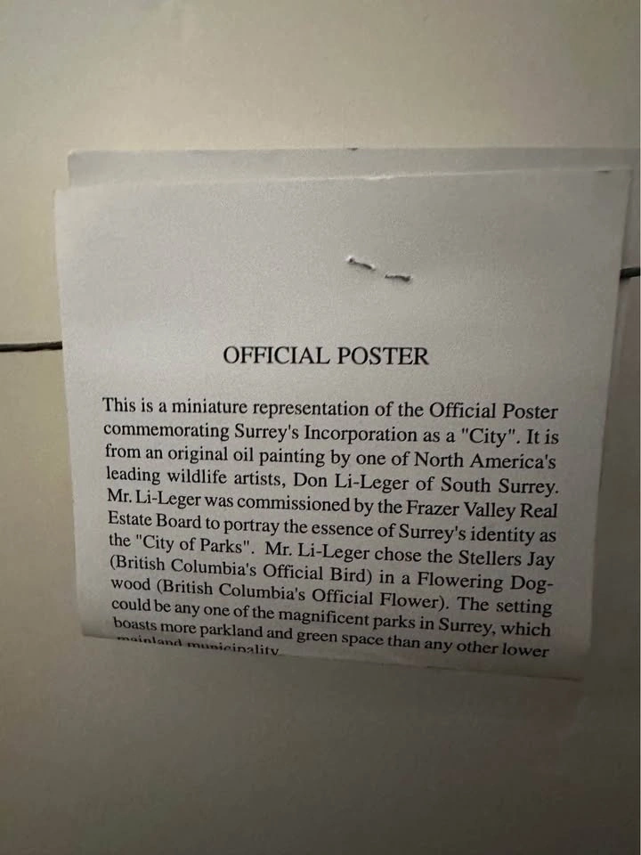 Hand-signed on the poster (not the mat). Image 16.25” × 25”, matted to 21 5/8” × 31 3/8”. Excellent condition. No frame. Made for the incorporation of Surrey as a city (1993).