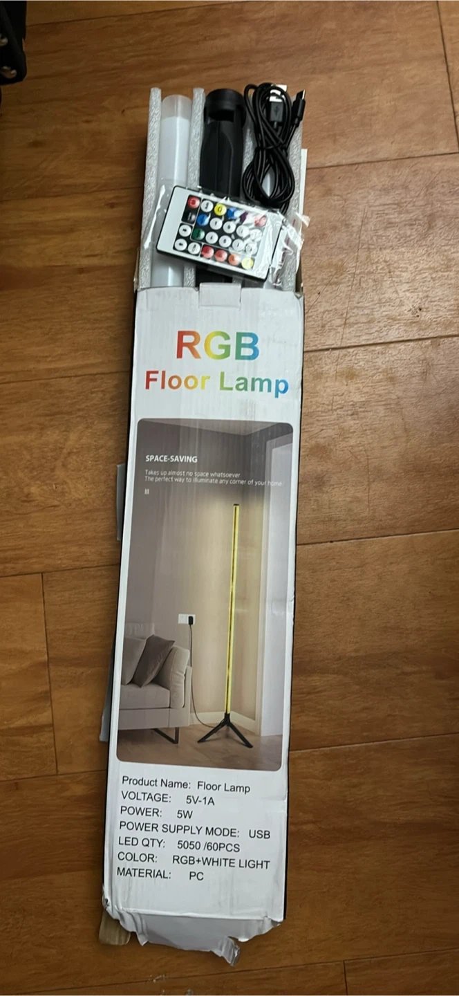 This RGB floor lamp offers space-saving design with adjustable RGB and white light. It's powered via USB and made of PC material. The lamp includes a remote for easy control of the 5050 LED lights. It's useful for adding ambient lighting to any room.
