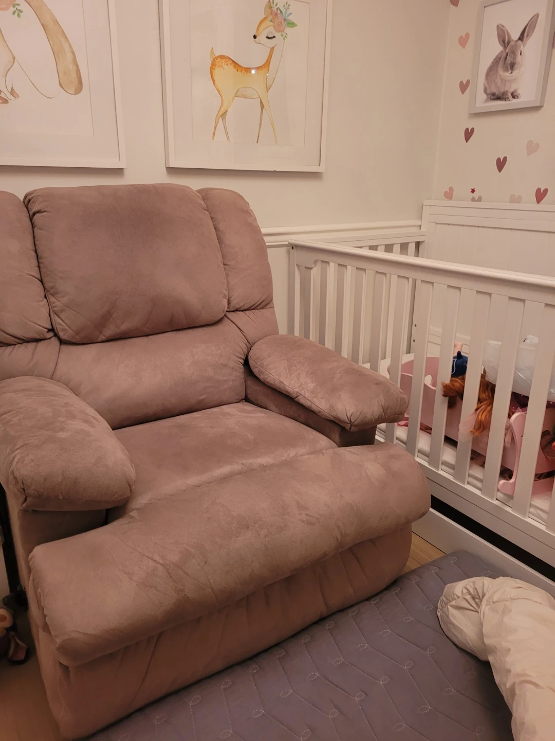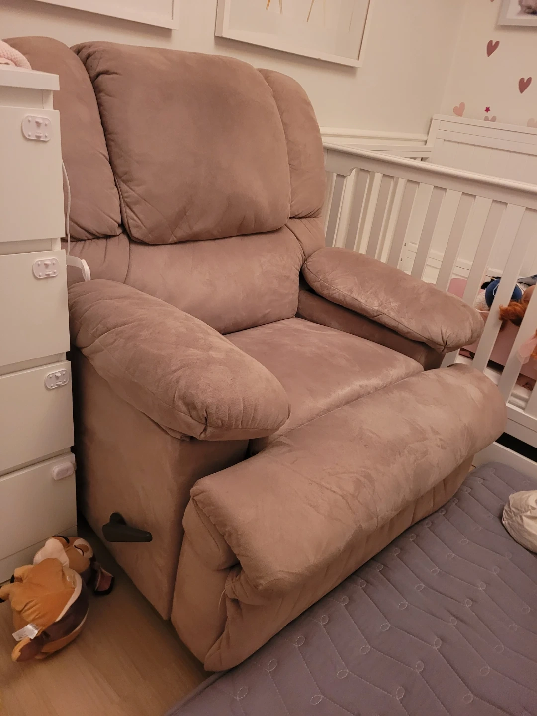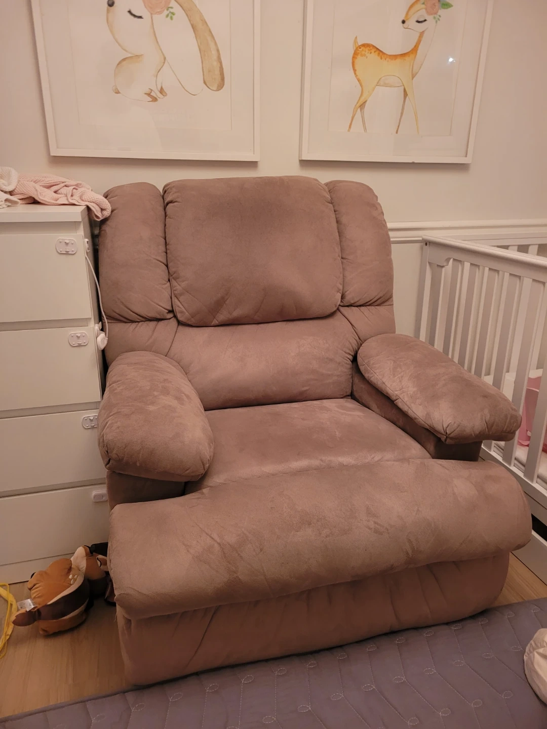 Comfortable recliner chair in a soft brown fabric. Features built-in cup holders for convenience. Perfect for a nursery or living room. I used to put baby to sleep.