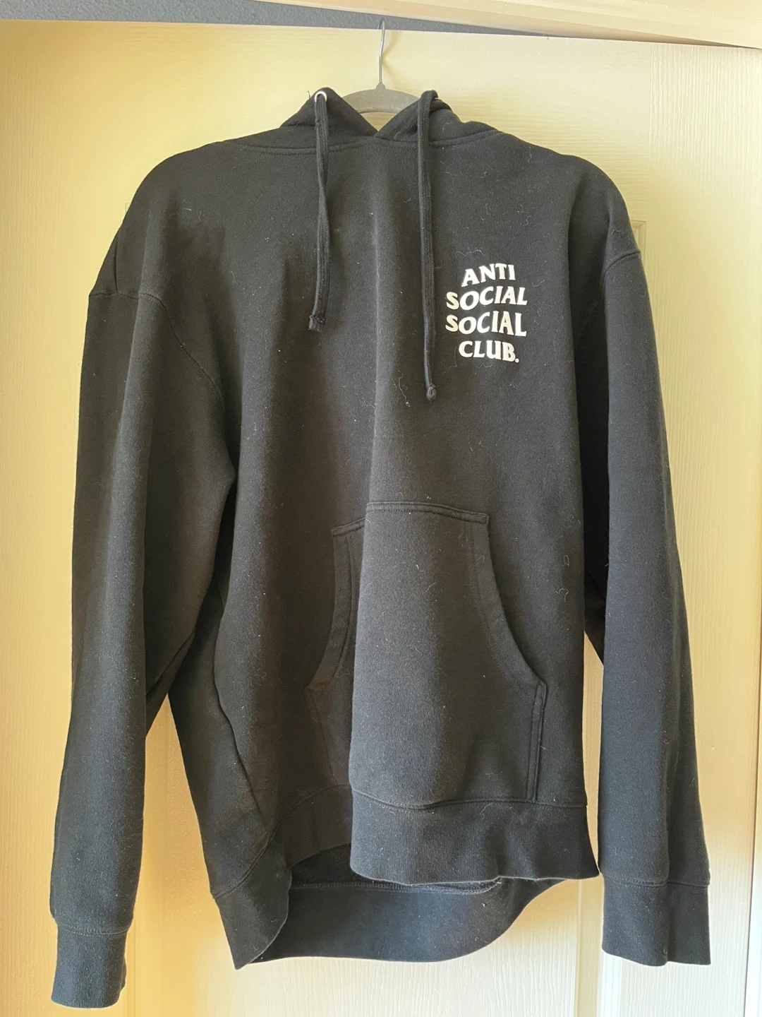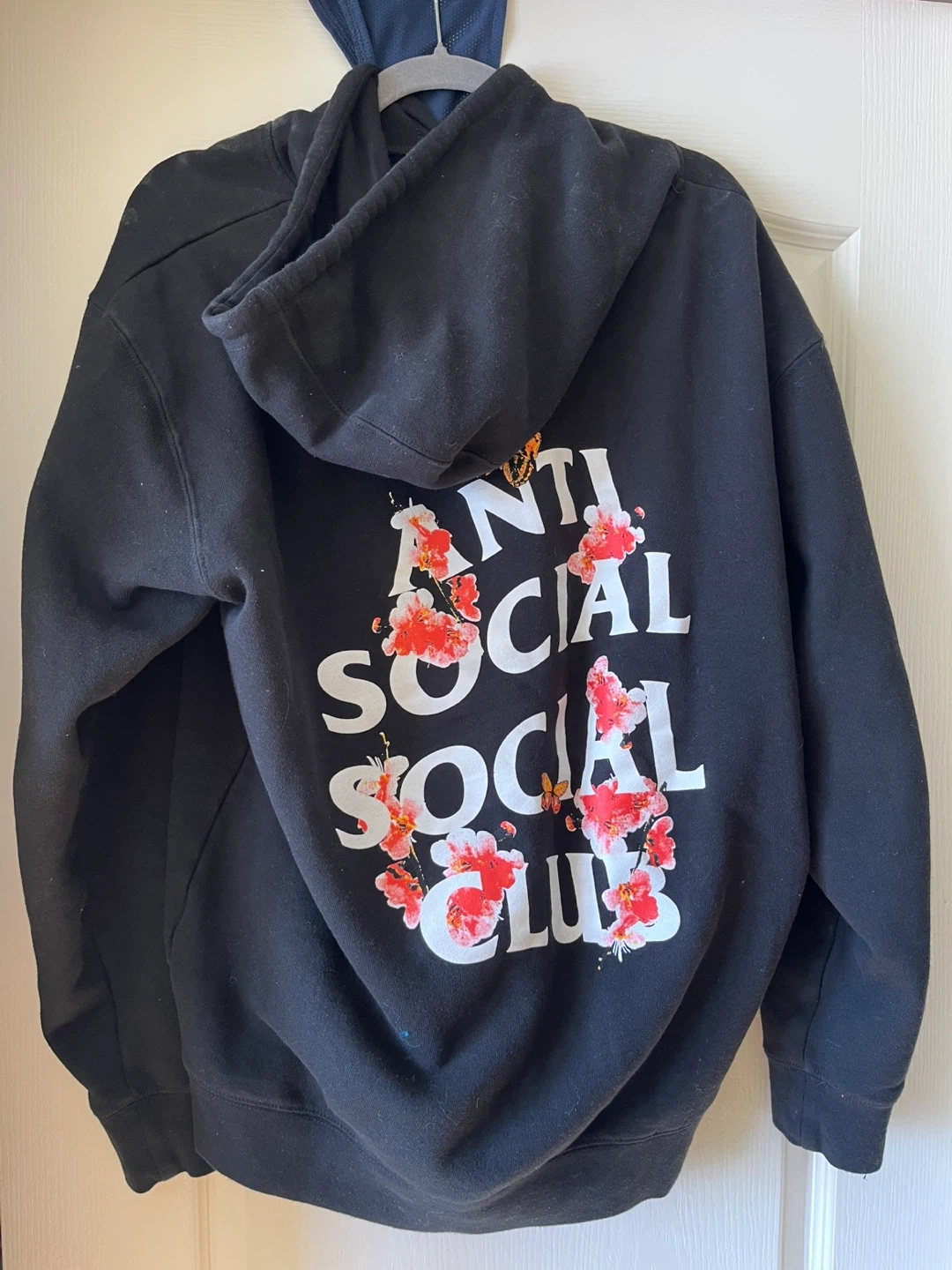 This is a black Anti Social Social Club hoodie with a floral design on the back. It features a front pouch pocket and adjustable drawstring hood. Made from a soft, comfortable material.