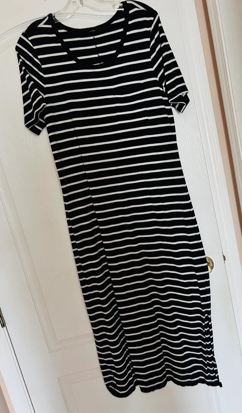 A comfortable, casual maxi dress with black and white stripes. It's made from a soft, stretchy cotton material. This dress is great for everyday wear.