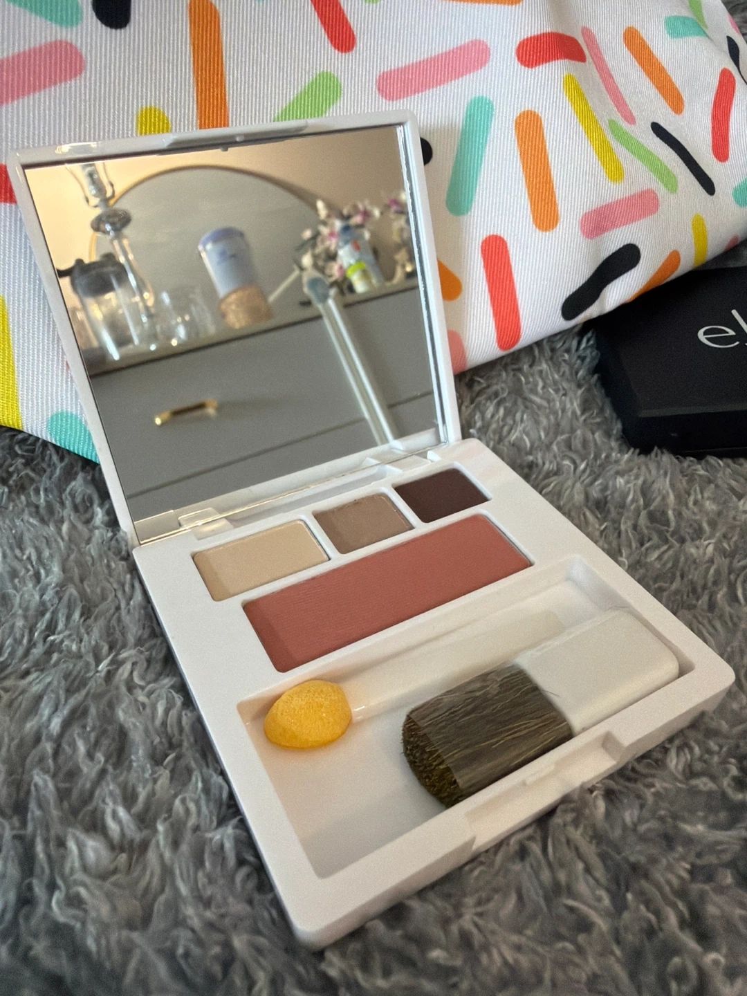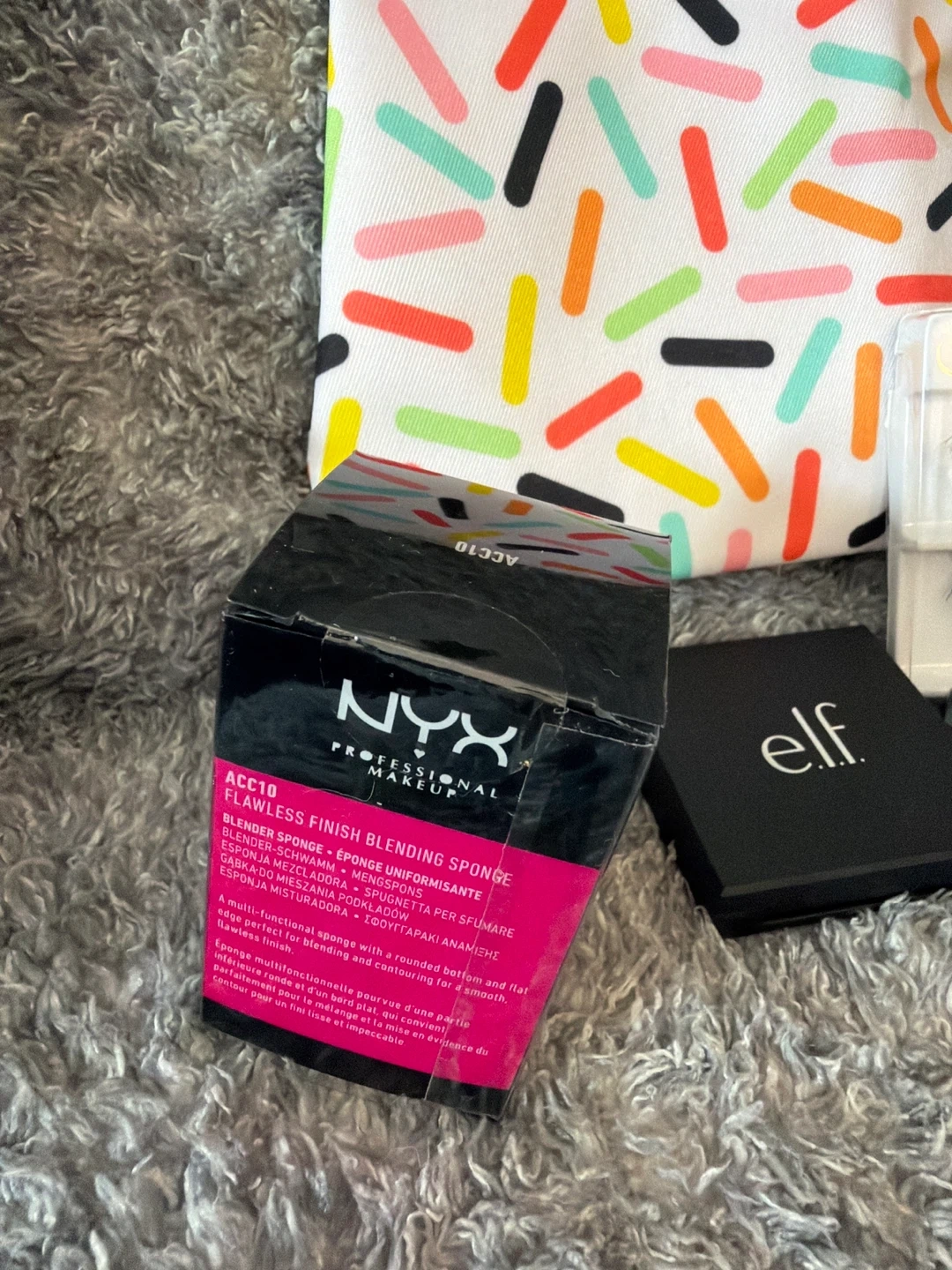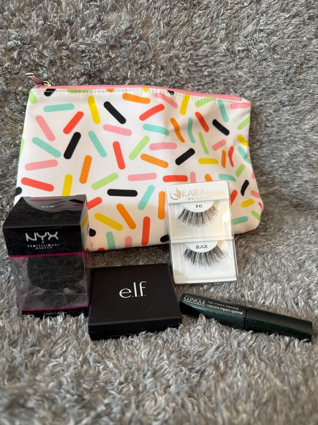 This bundle includes a NYX Flawless Finish Blending Sponge, an Elf eyeshadow palette, two pairs of Kara Beauty false lashes, and a Clinique High Impact Mascara. It's great for a full makeup look!