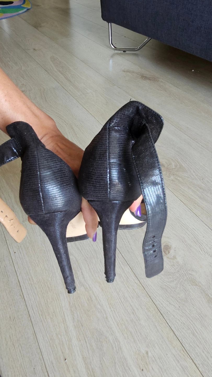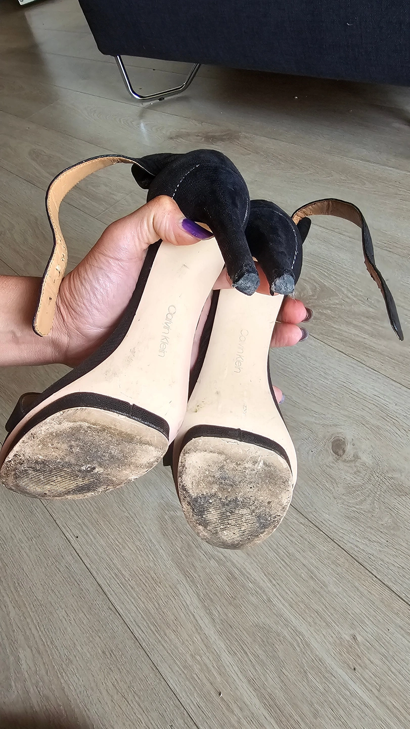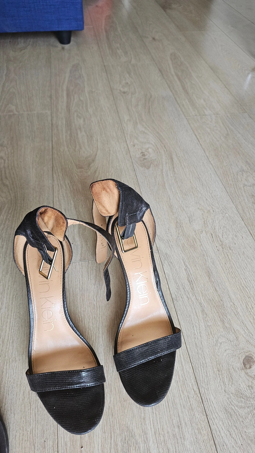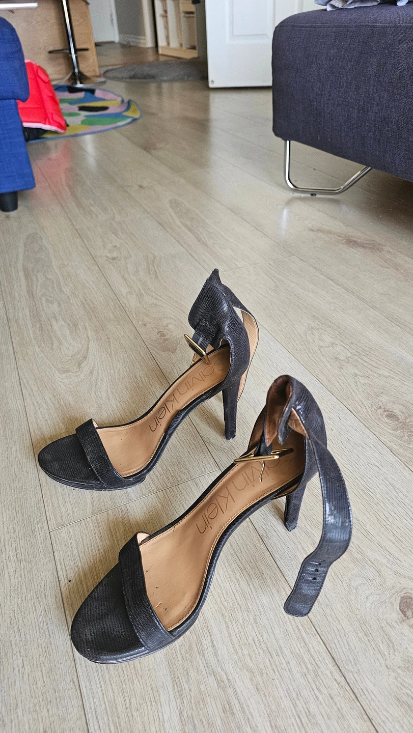 Black Calvin Klein heels with a strappy design. They show some signs of wear, especially on the soles, but still have lots of life left!