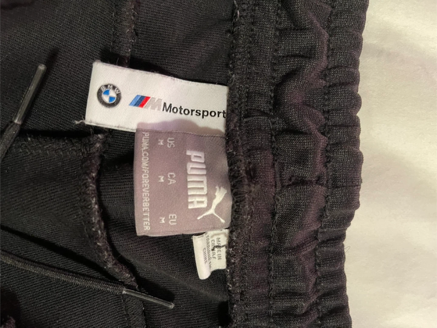This is a Puma BMW Motorsport track jacket and pants set. Jacket is size L, pants are size M. Both are white and black with Motorsport accents.
