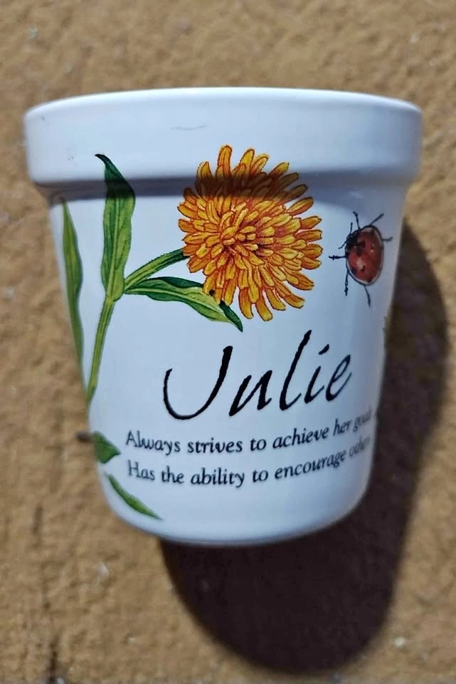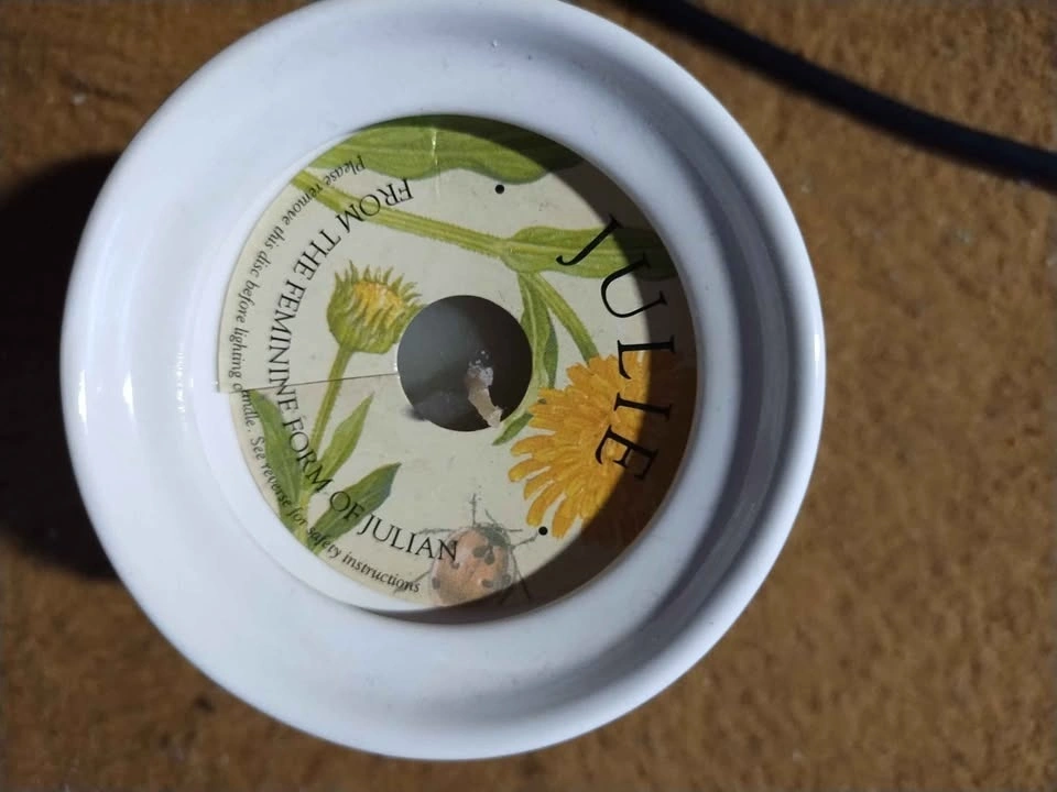 This is a small ceramic candle from the brand History & Heraldry. It features a calendula flower and ladybug design with the name "Julie" and meaning of the name printed on it. This candle hasn’t been used before. Size Width - 7cm Height - 7cm