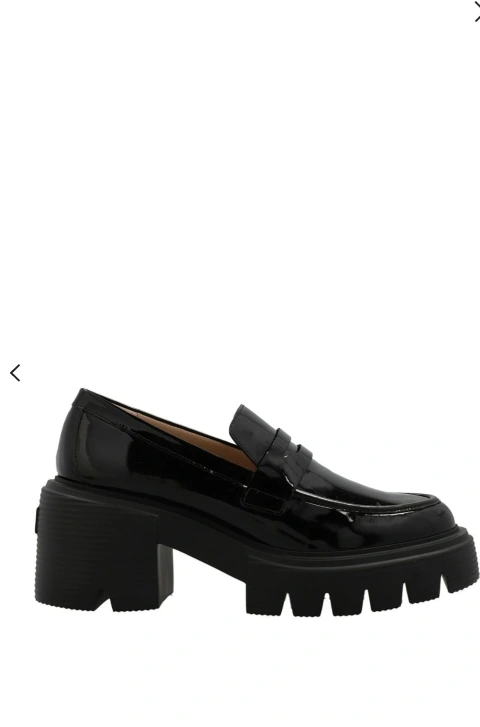 Check out these stylish Stuart Weitzman loafers! They feature a sleek black patent leather finish and a chunky heel for a bit of extra height and a modern look. Perfect for adding a touch of sophistication to any outfit!