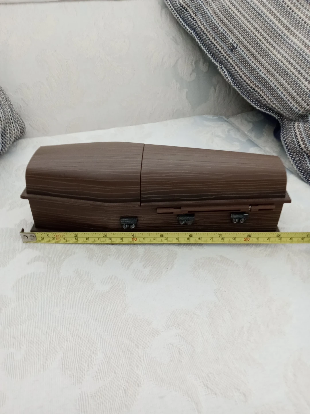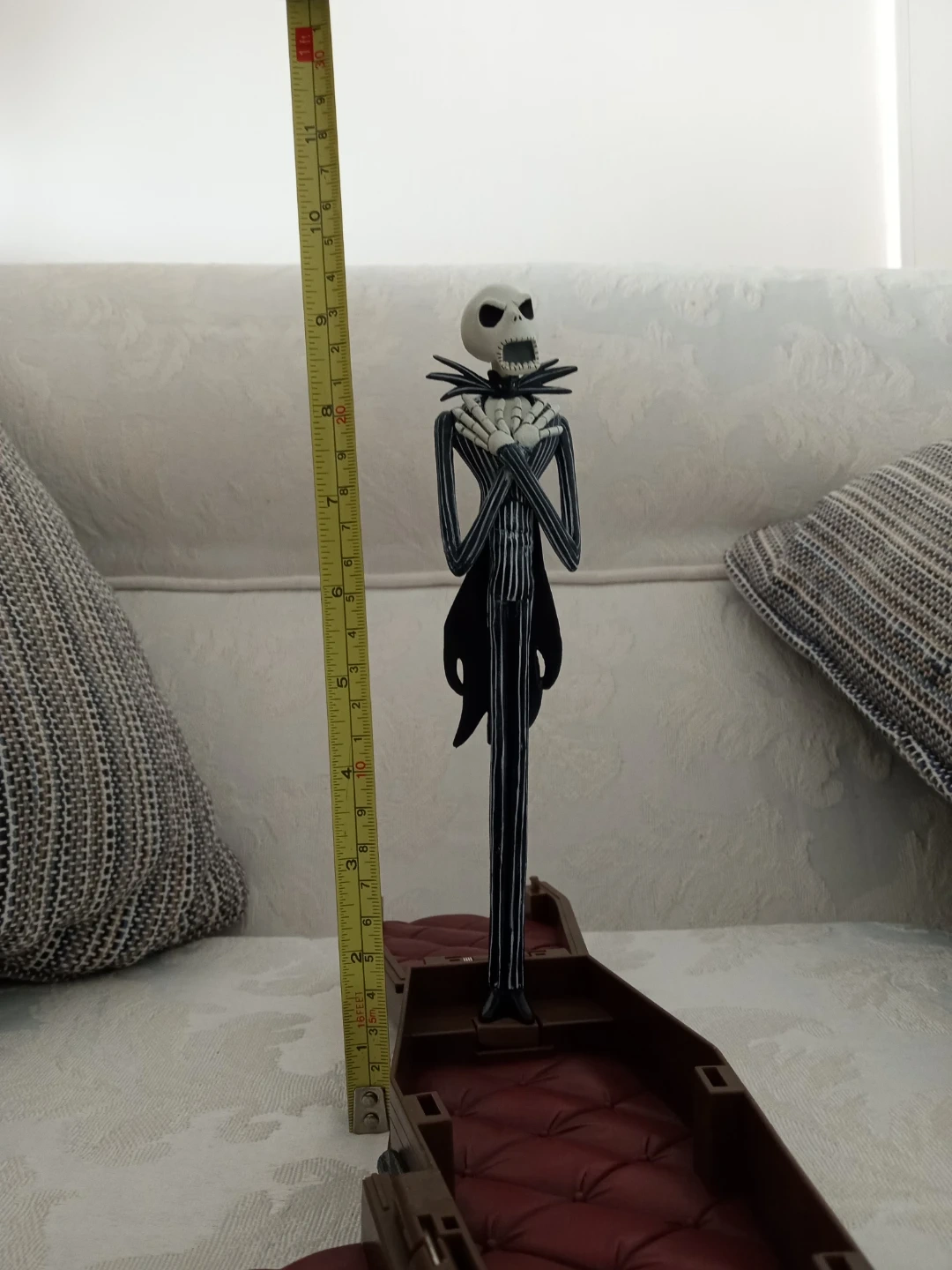 This is Tim Burton's The Nightmare Before Christmas Jack in Coffin toy! It features Jack Skellington with pop-up action and sound when the coffin opens. Recommended for ages 14 and up. Needs a new battery for audio effects.