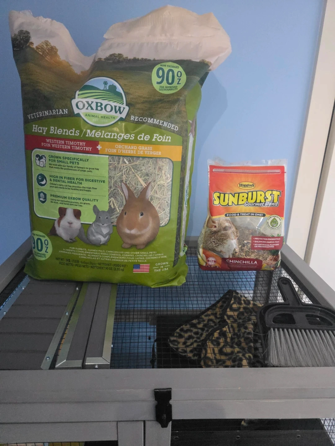 Spacious multi-level cage for small pets like rabbits or chinchillas. Includes a wheel, ramps, bowls, and a hideout. Also comes with a bag of Oxbow Hay Blends and Higgins Sunburst food. Some extra plastic panels and zip ties are included. It's perfect for giving your small animal plenty of room to play and explore!