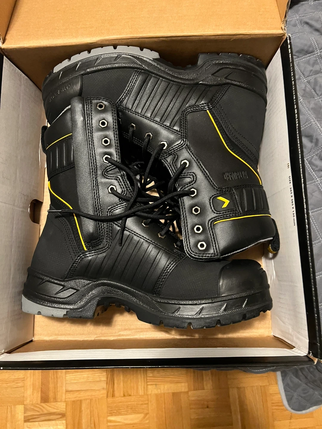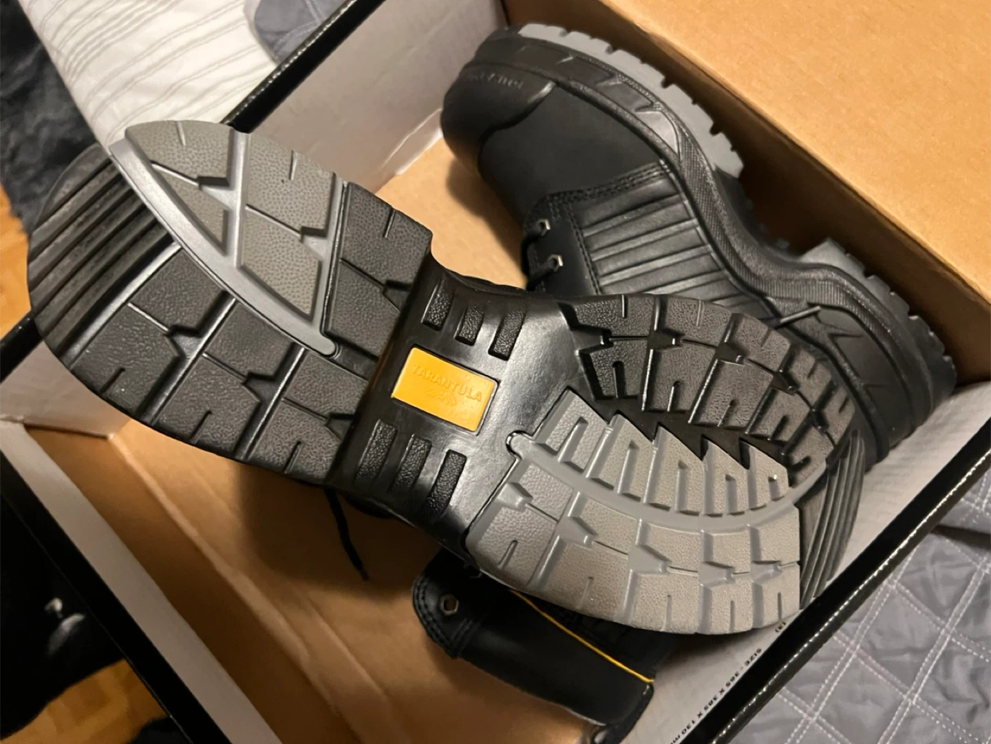 Terra T-Max Quad Comfort boots with Tarantula Antislip Armour-Flex. These men's boots are size 11 and black with yellow accents. They offer insulation and are designed for work. Never wear them