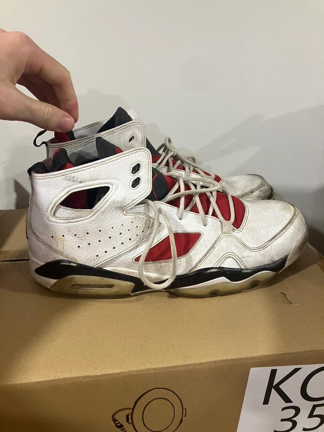 White and red Air Jordan 6 Retro basketball shoes. Leather and synthetic upper with a rubber sole. These sneakers show signs of wear. Perfect for collectors or casual wear!