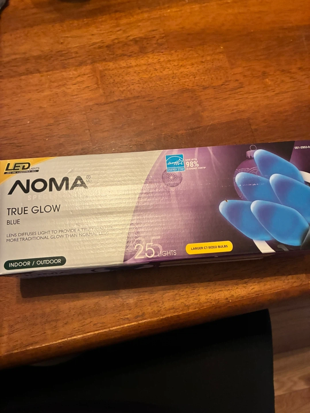 Noma True Glow LED string lights in blue. There are 25 lights on the strand. These are suitable for indoor or outdoor use. They diffuse light for a more traditional glow than normal LEDs.
