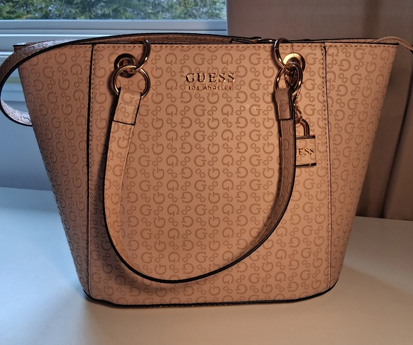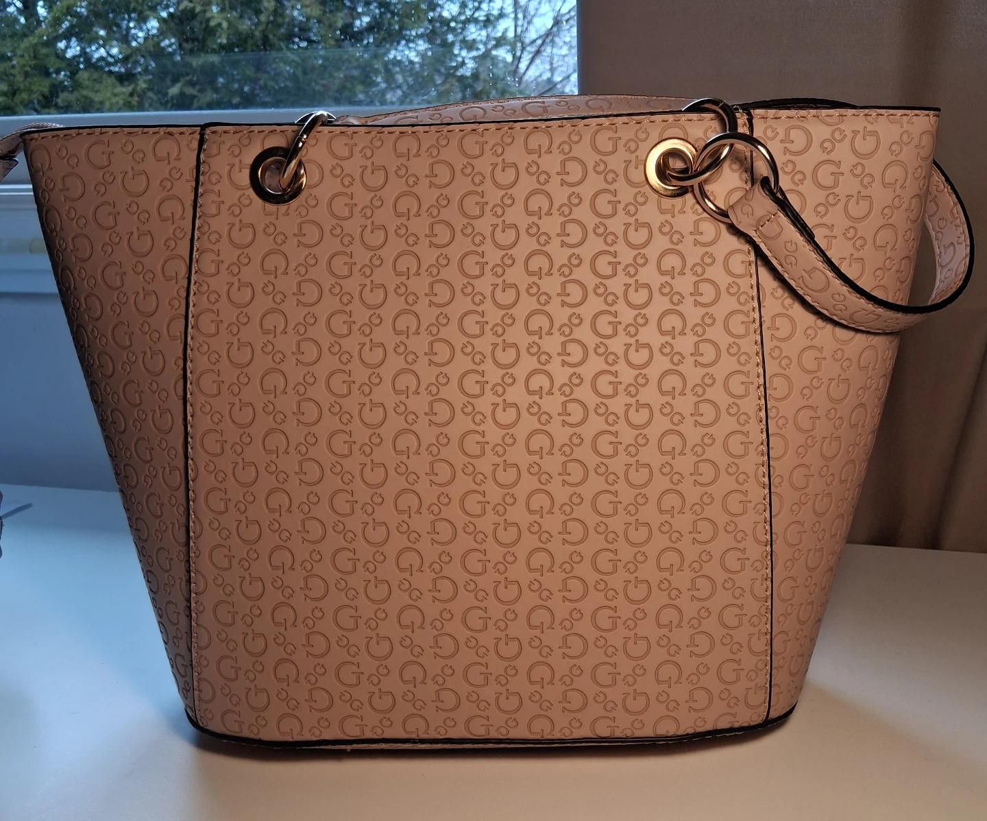 Stylish pale pink tote bag with all-over 'G' logo print. It features gold-tone hardware and a secure zip closure. The interior has multiple pockets for organization.