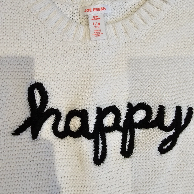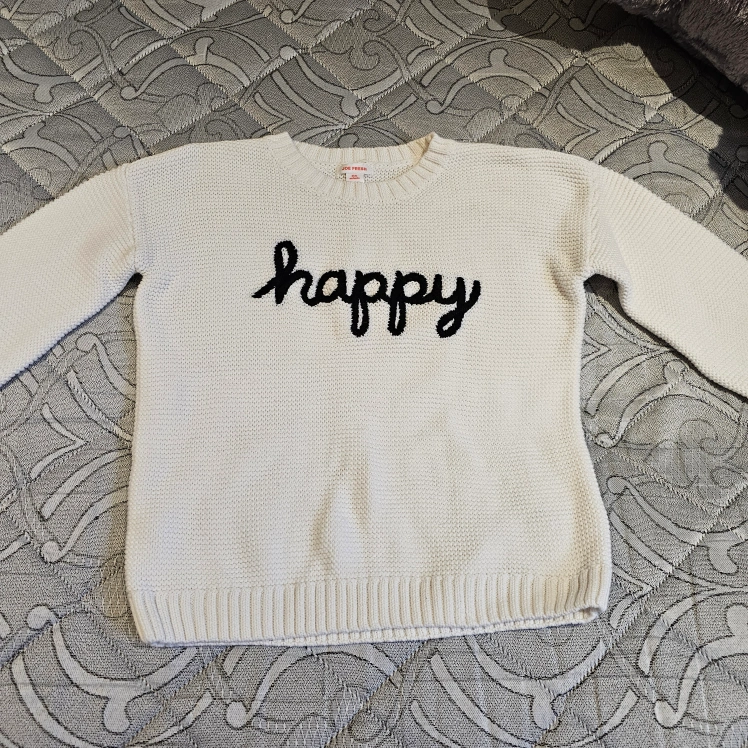 Adorable off-white sweater. Features a large black embroidered "happy" on the front. Size L 10-12. never used.