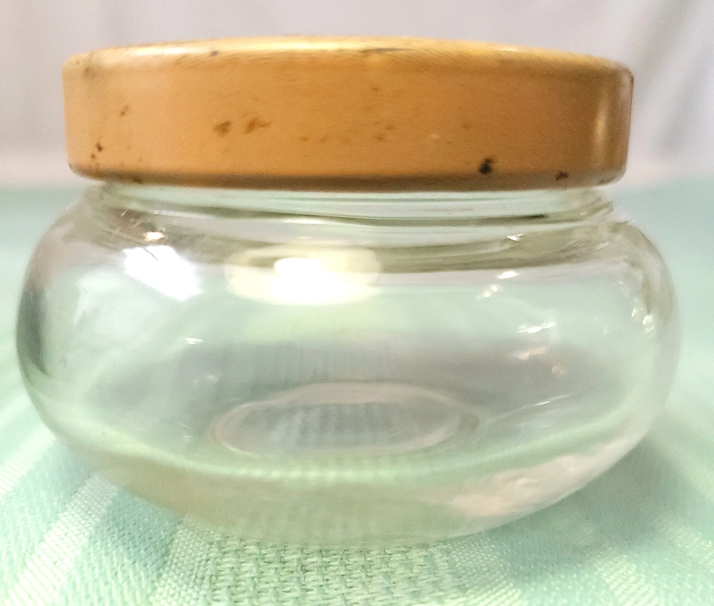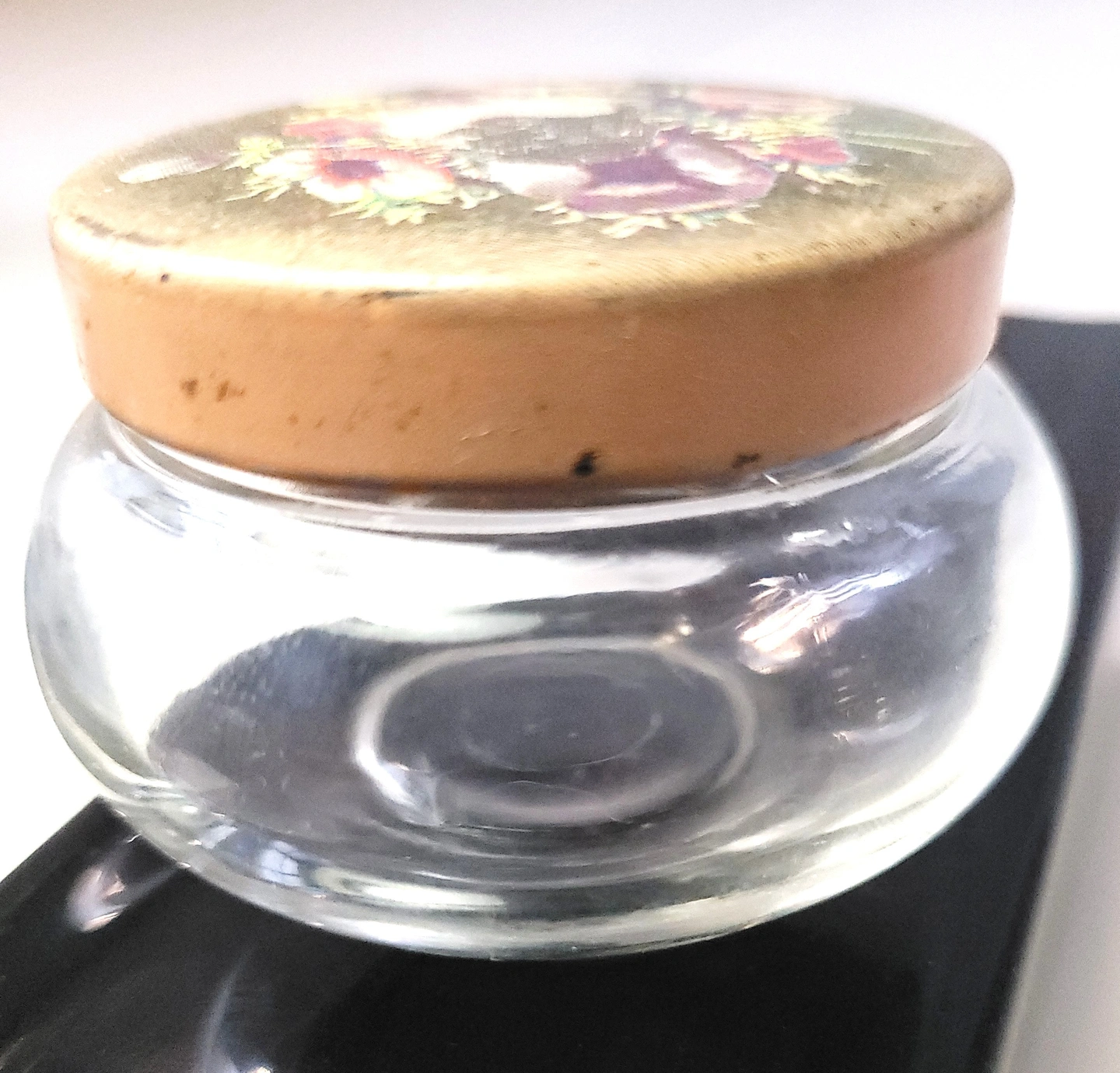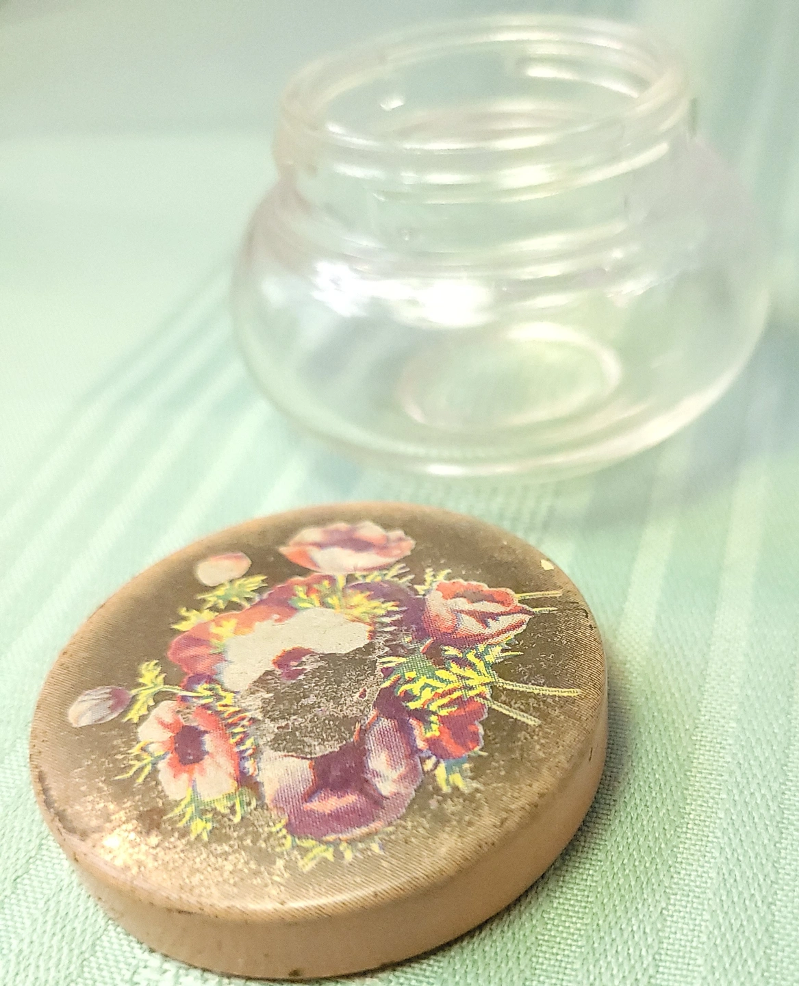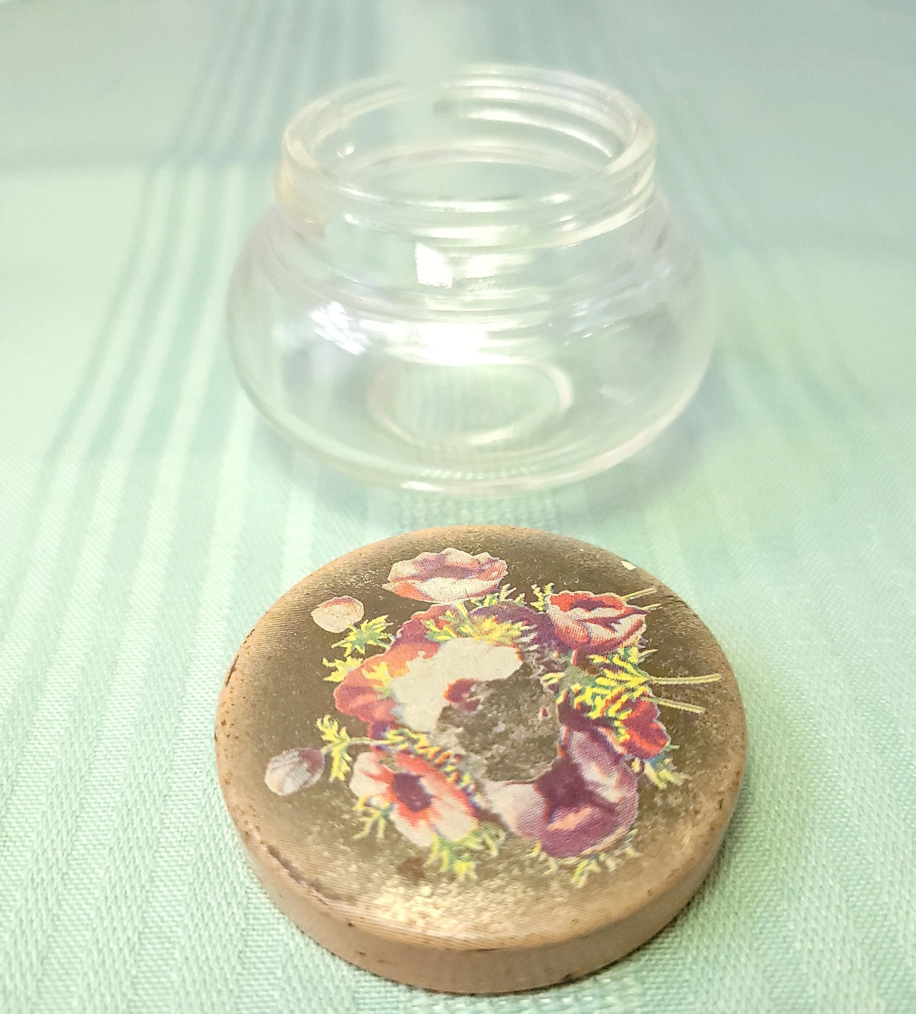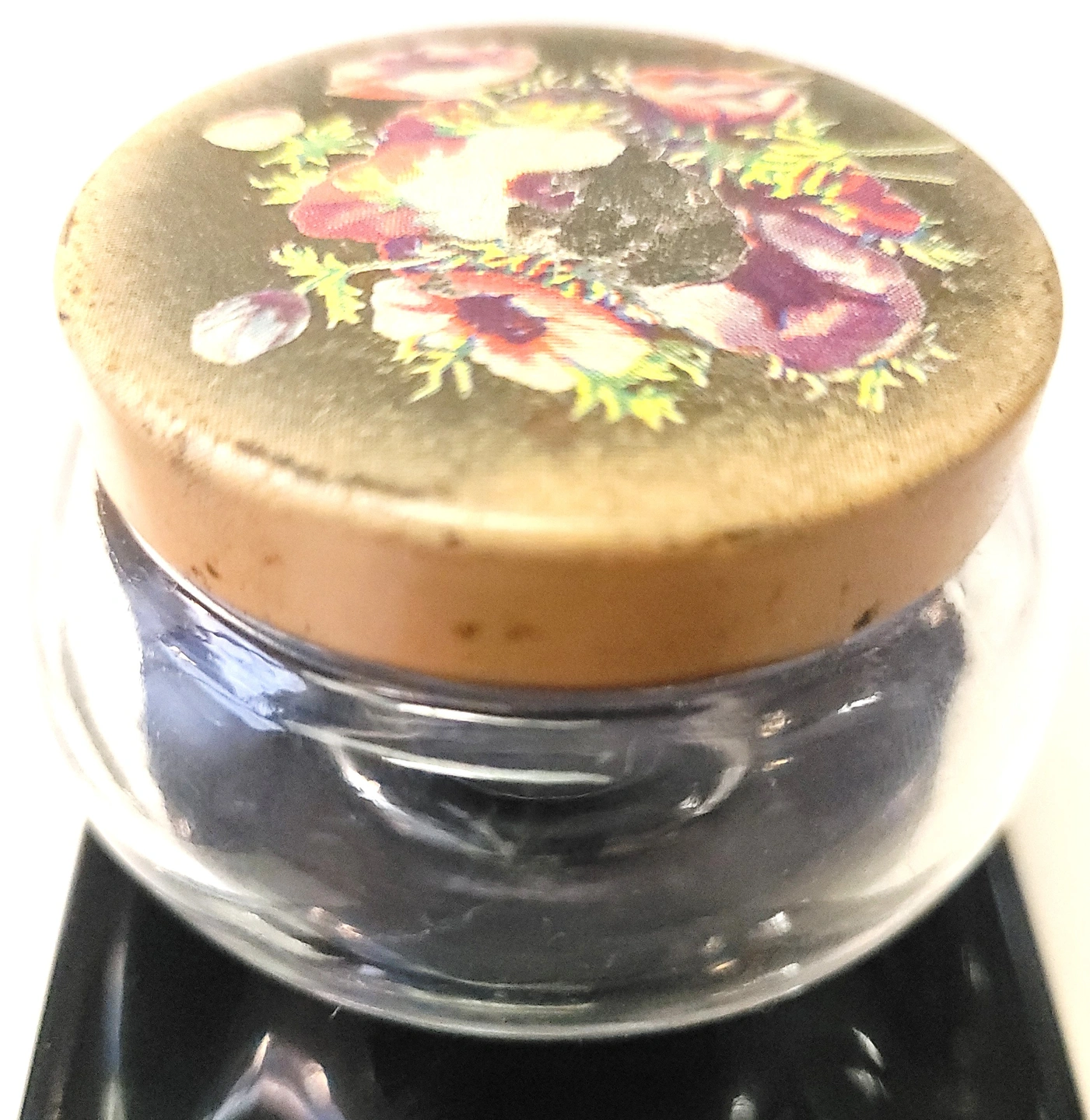 The glass base is intact with no chips or cracks. The metal lid shows light wear consistent with age, including surface scratches and some fading/loss to the central lithographed floral pattern as visible in the photos. Overall, the piece is in good vintage condition.